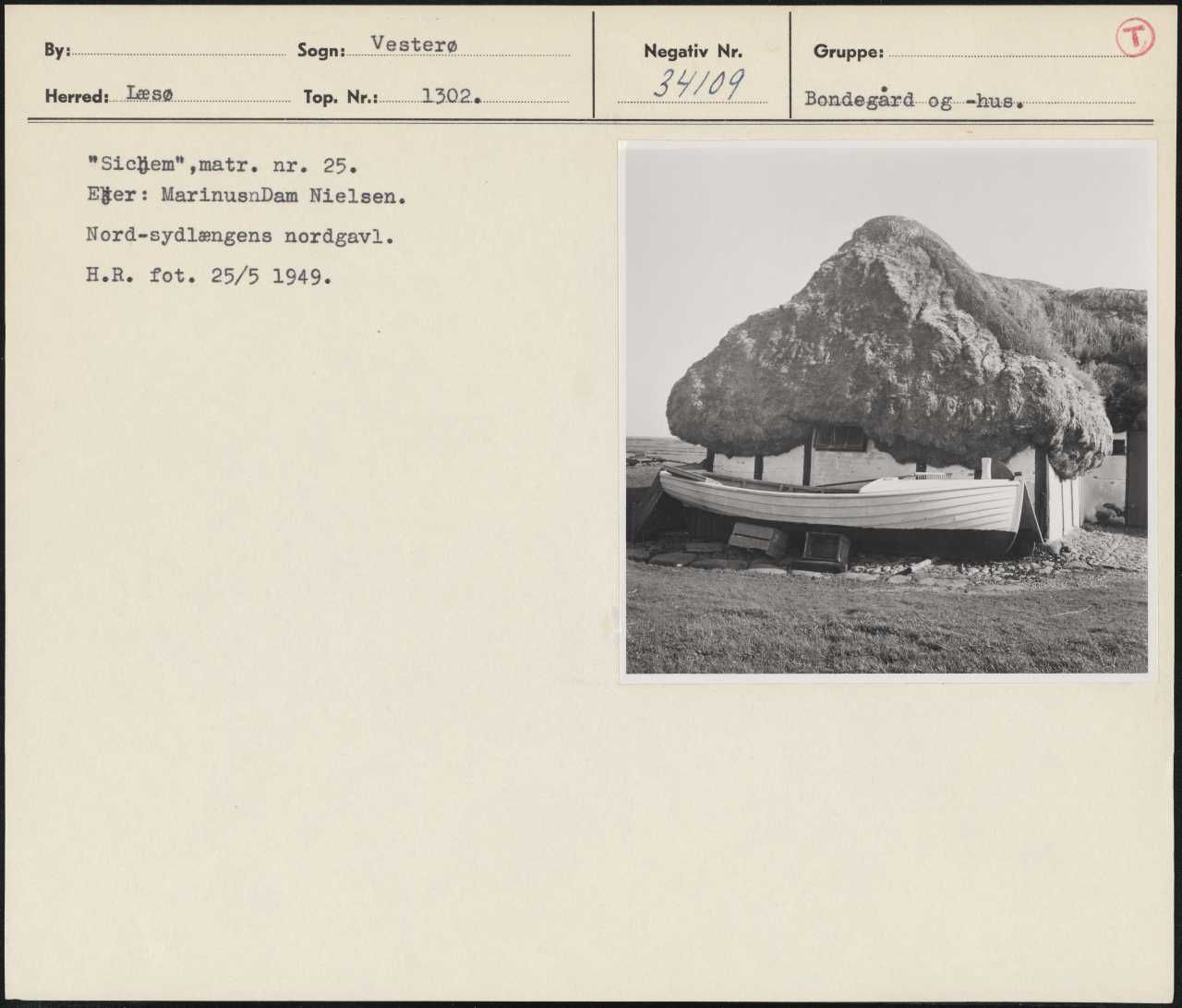 Maskingenkendt tekst fra arkivkort. SicHem",matr. nr. 25. Ejer: MarinusnDam Nielsen. Nord-sydlængens nordgavl. H.R. fot. 25/5 1949.