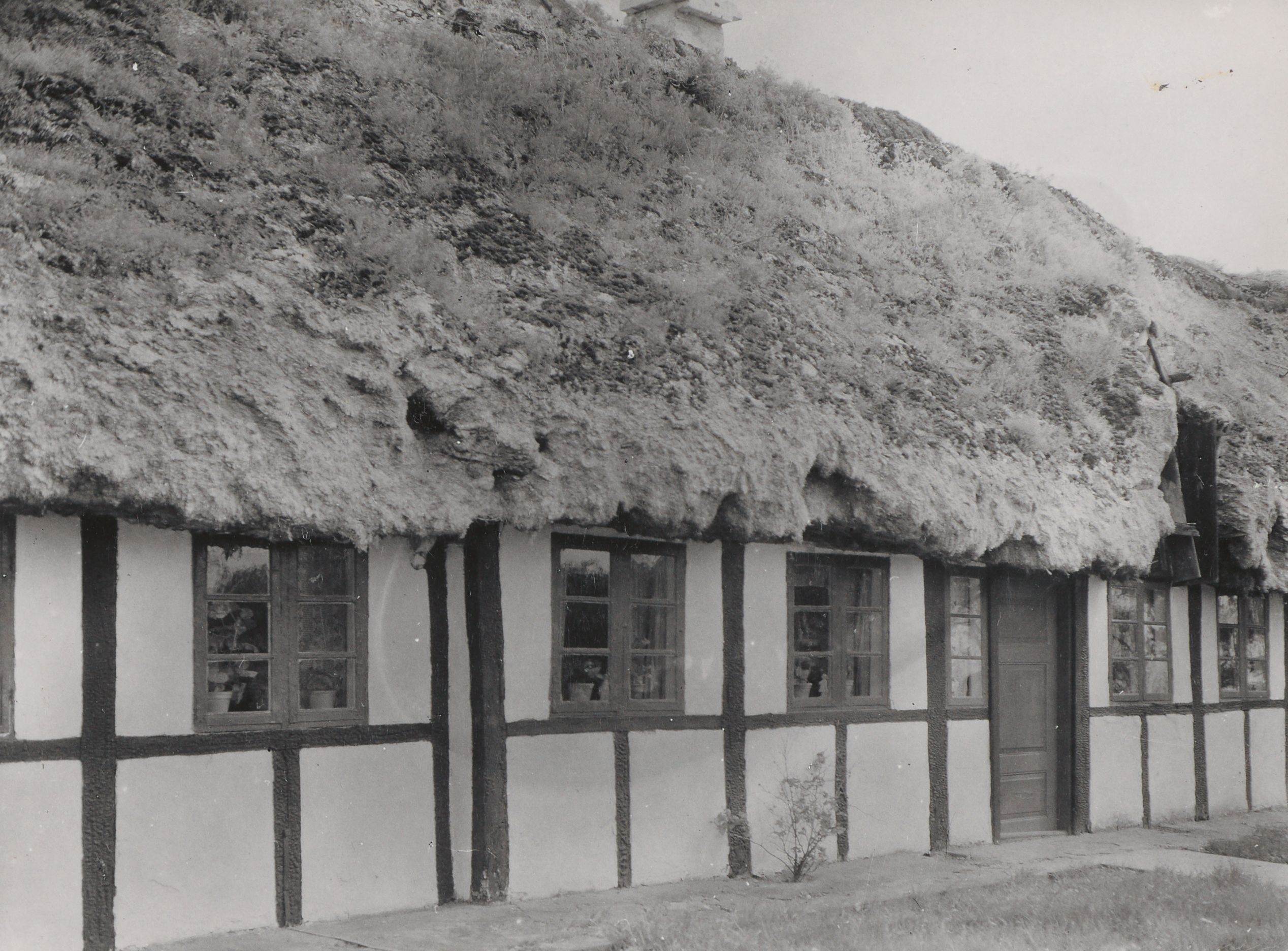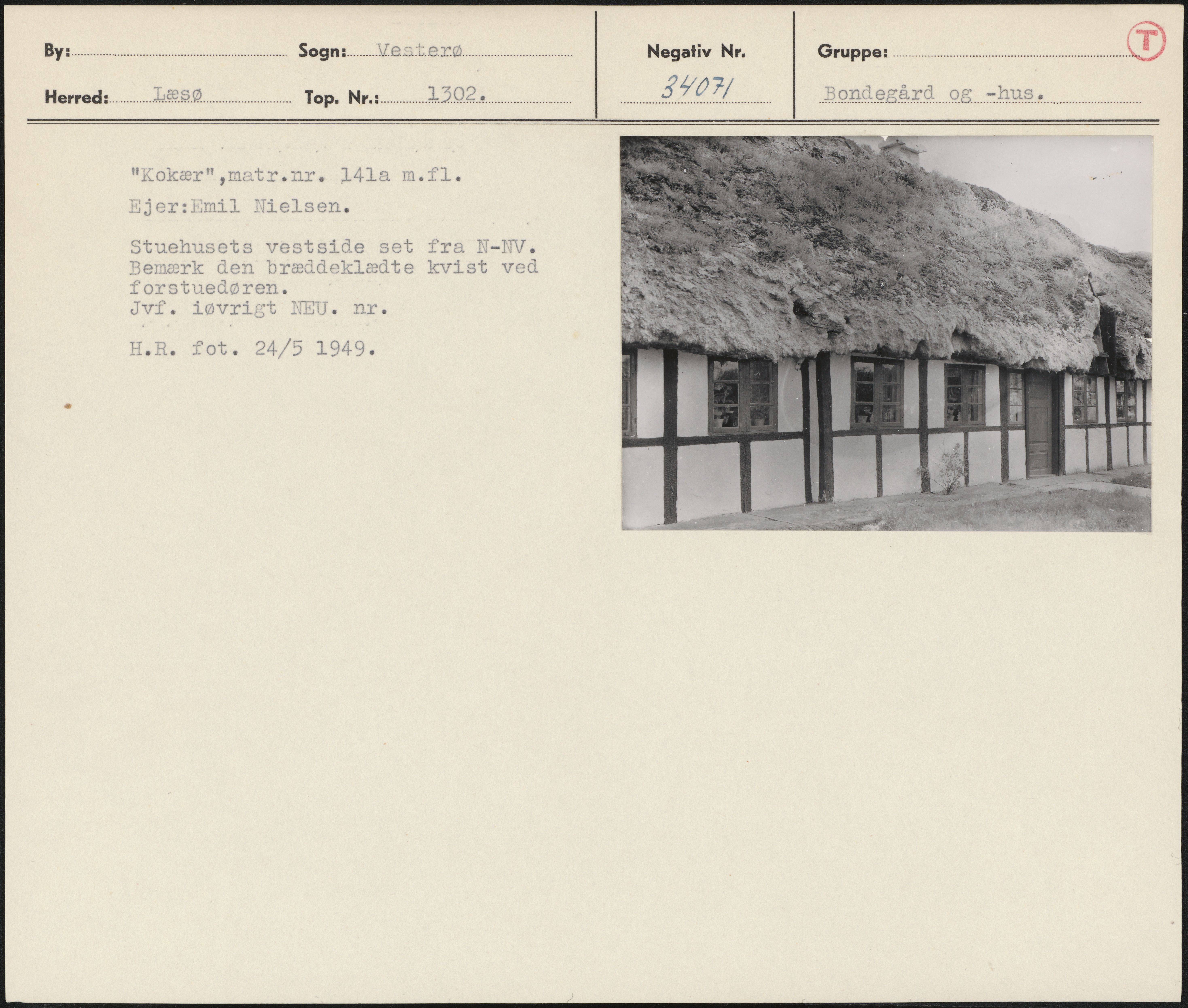 Maskingenkendt tekst fra arkivkort. Kokær",matr.nr. l4la m.fl. Ejer:Emil Nielsen. Stuehusets vestside set fra N-NV. Bemærk den bræddeklædte kvist ved forstuedøren. Jvf. iøvrigt NEU. nr. H.R. fot. 24/5 1949.
