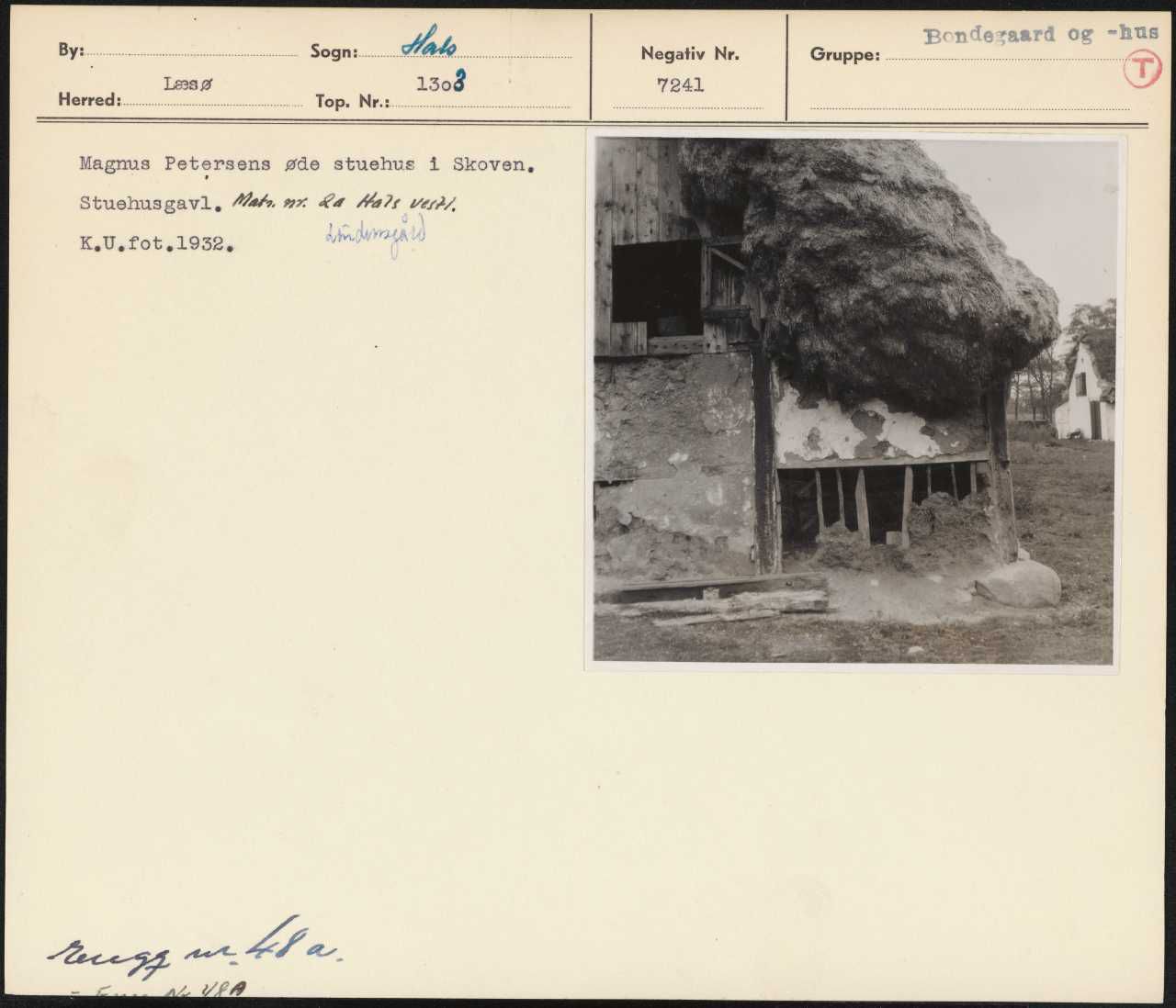 Maskingenkendt tekst fra arkivkort. Magnus Petersens øde stuehus 1 Skoven, Stuehusgavl, Hat mr <a Kar ver, K.U.fot,1932, duindurssk 5 Beg At Af al -2 2/0A