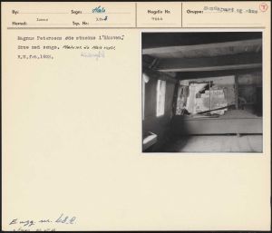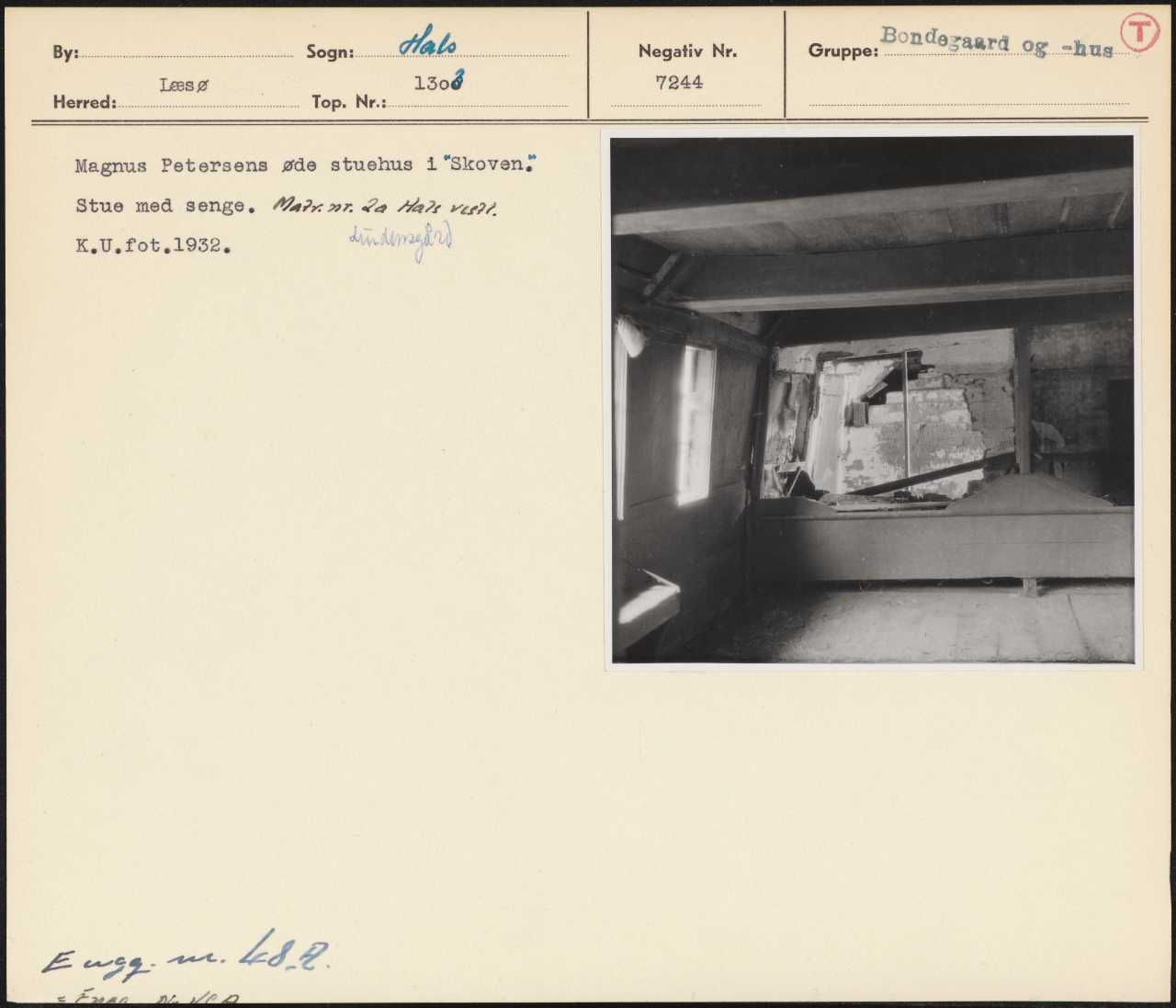 Maskingenkendt tekst fra arkivkort. Magnus Petersens øde stuehus 1"Skoven; Stue med senge. arr »r 4a sæ? riet? ry fr 2. K.U.fot.1932. hiv dlinssd u