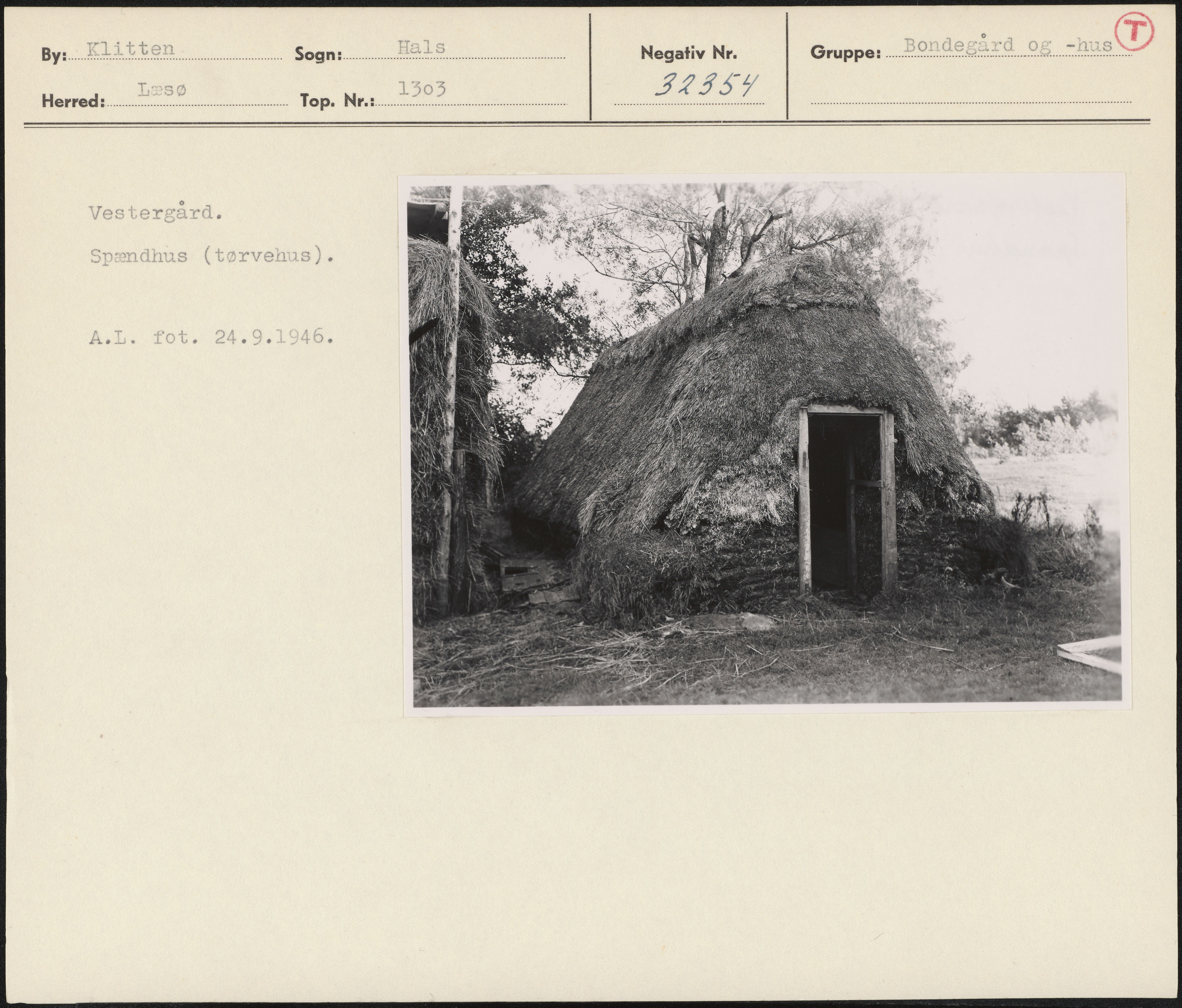 Maskingenkendt tekst fra arkivkort. Vestergård. Spændhus (tørvenus). A.L. fot. 24.9.1946.