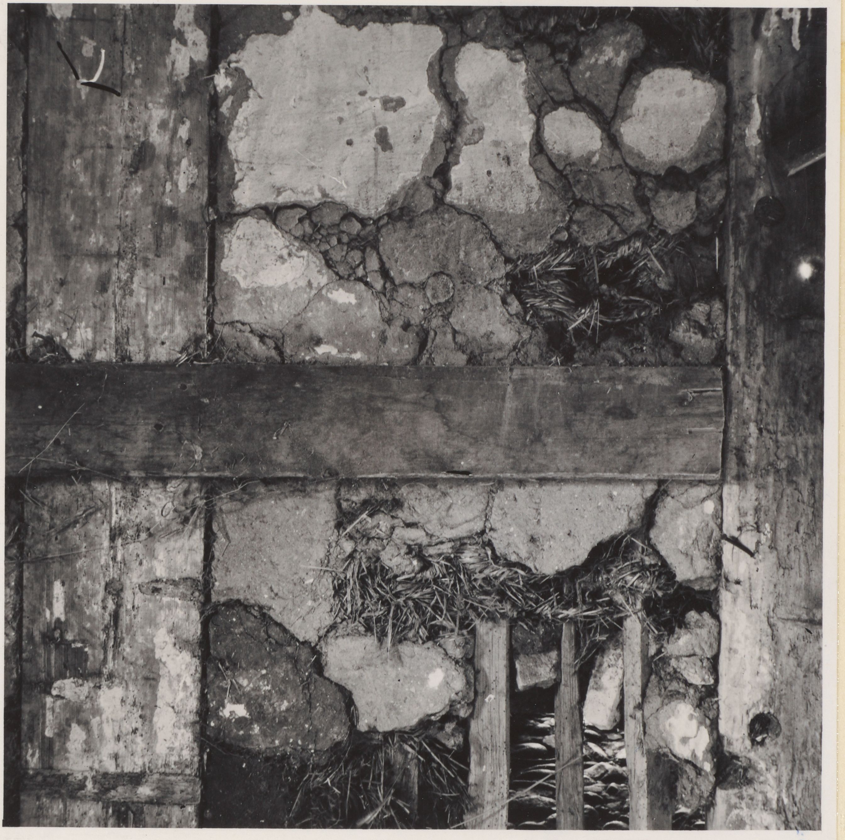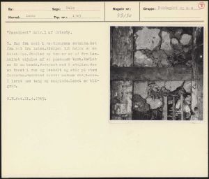 Maskingenkendt tekst fra arkivkort. Paradiset" matr.l af ssterby. 3. fag fra nord i vestlængens østside.Set fra øst fra laden.Stolpen til nøjre er en dørstclpe.Støjler og tøm er er af fyr.Løs- holtet skjules af et pusøunet bræt.lavlet er 62 cm bredt,forsynet med 5 støjler,der er boret i rem og løsholt og står på sten forneden.Halmbånd vundet mellem støjlerne. I leret ses tang og smupinde.Leret er blå- gråt. 0.H.fot.11.4.1949.