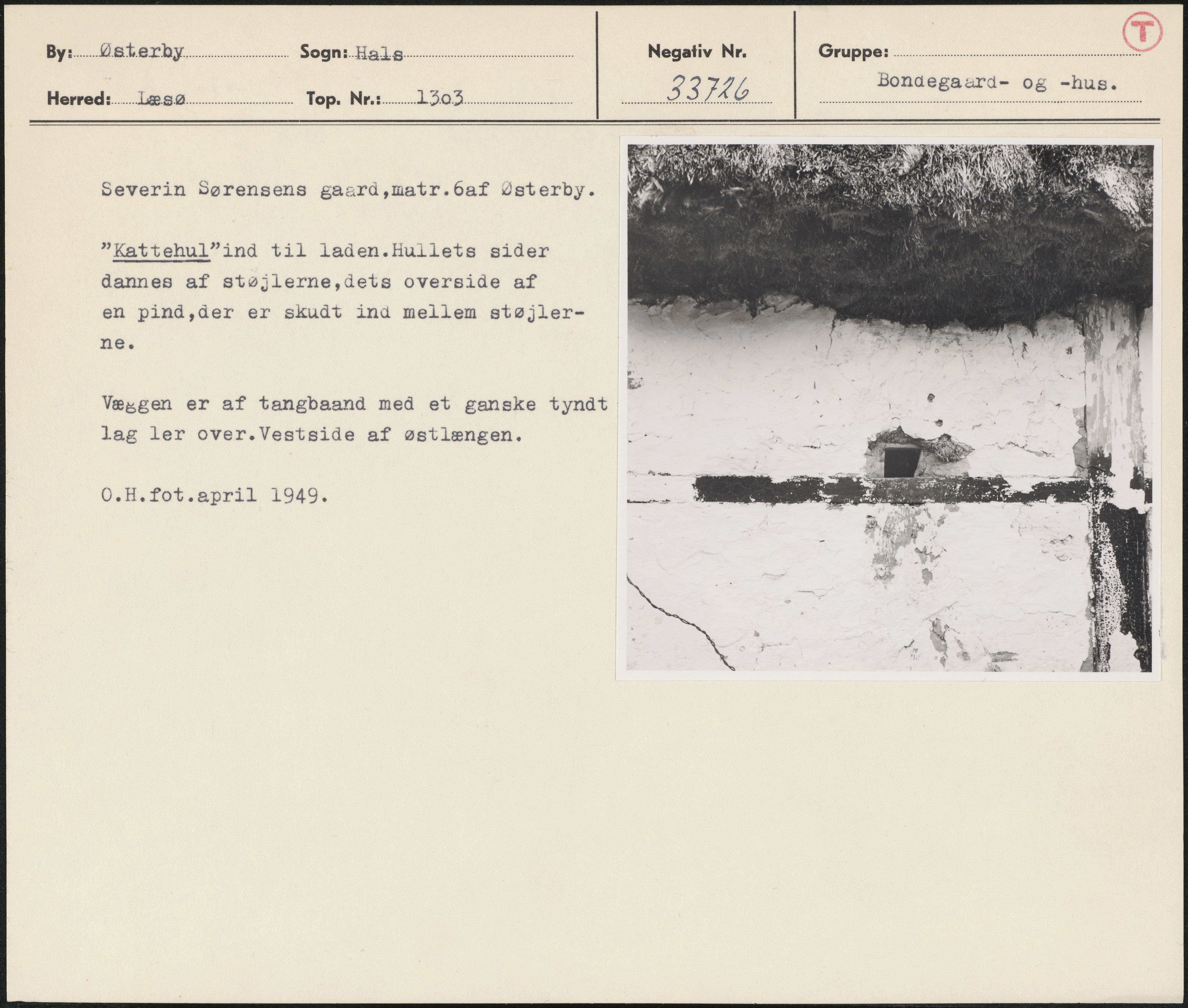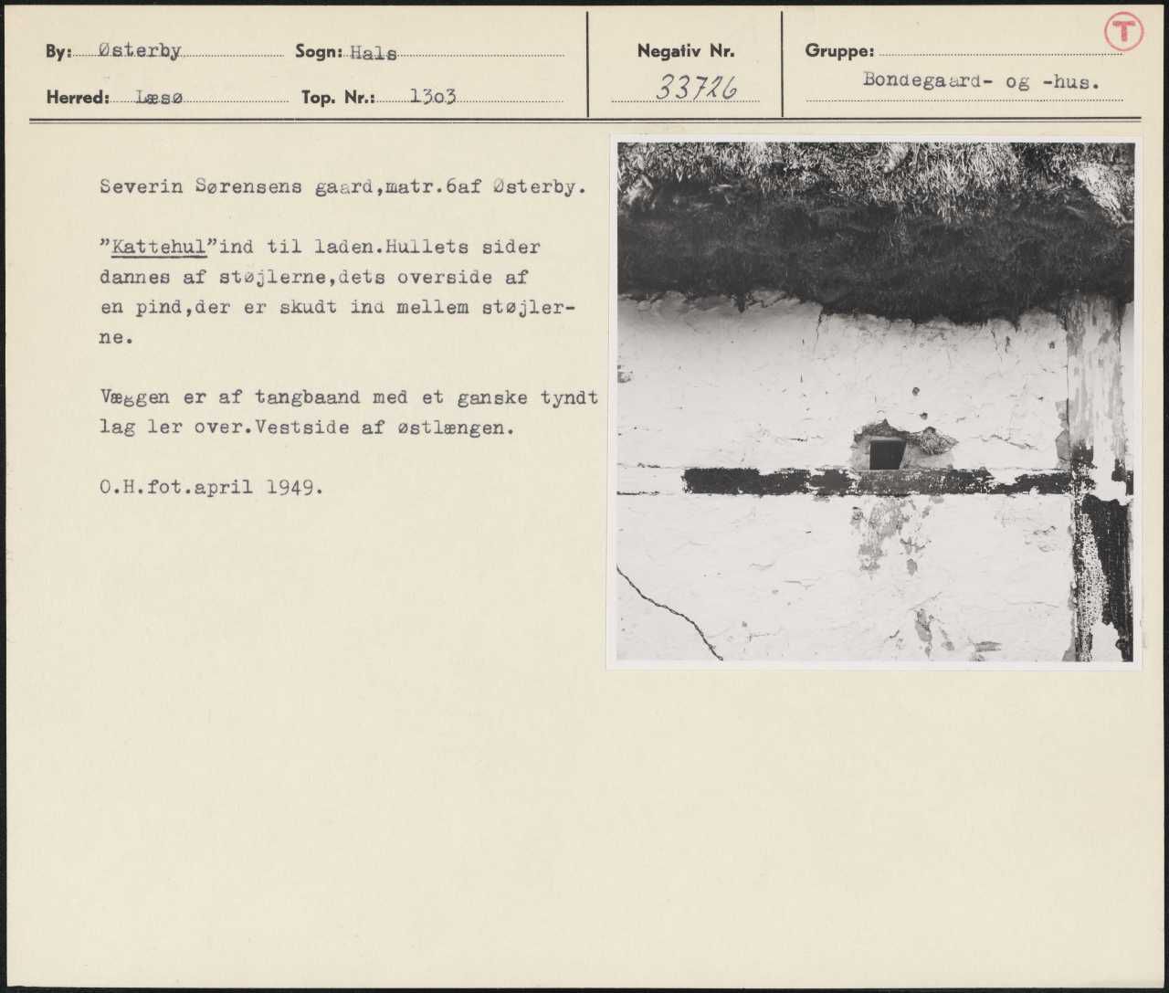 Maskingenkendt tekst fra arkivkort. Severin Sørensens gasrd,matr.6af Østerby. ”Kattehul”ind til laden.Huillets sider dannes af støjlerne,dets overside af en pind,der er skudt ind mellem støjler- ne. Væggen er af tangbaand med et ganske tyndt lag ler over.Vestside af østlængen. 0.H.fot.april 1949.