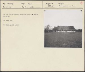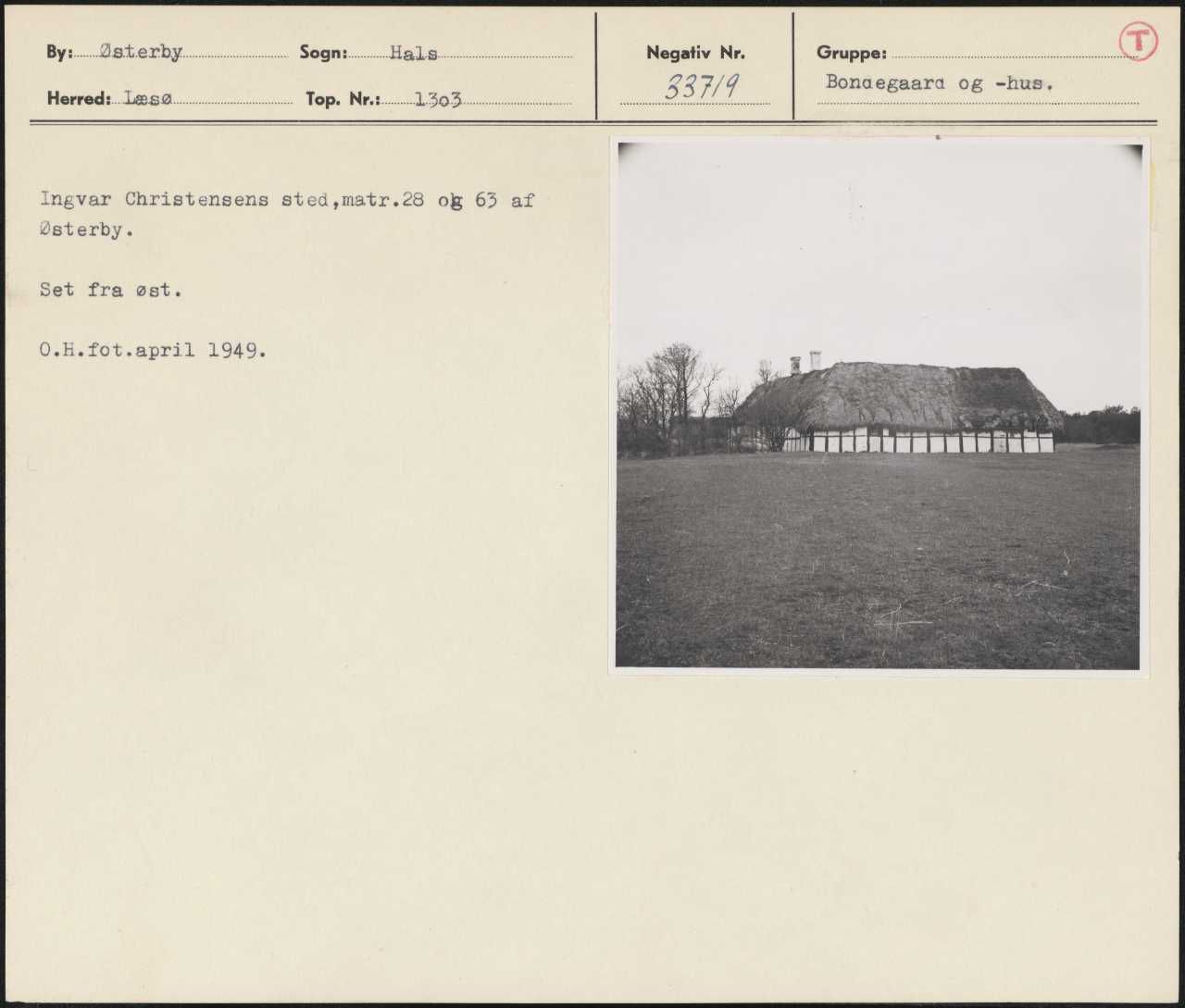 Maskingenkendt tekst fra arkivkort. Ingvar Christensens sted,matr.28 ok 63 af Østerby. Set fra øst. 0.H.fot.april 1949.
