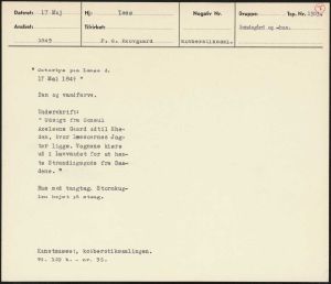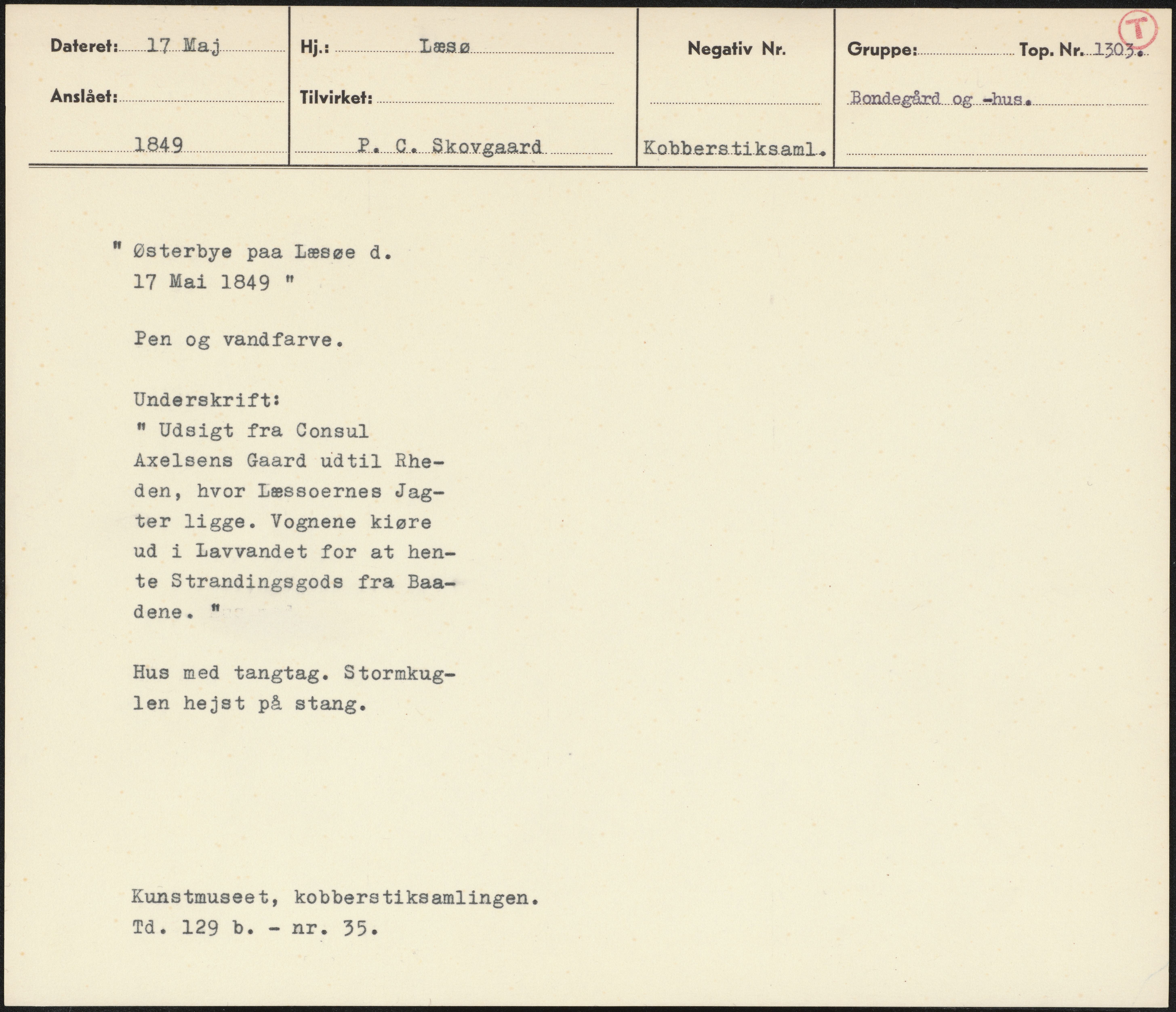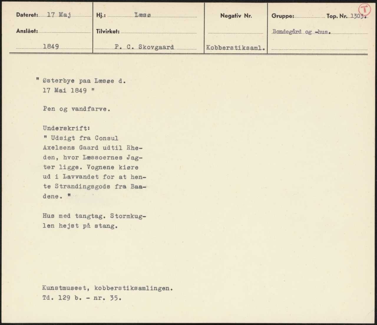 Maskingenkendt tekst fra arkivkort. 289 Pc. Skove kobberstiksemt. ” Østerbye paa læsøe då. 17 Mai 1849 " . Pen og vandfarve. Underskrift: " Udsigt fra Consul i Axelsens Gaard udtil Rhe- den, hvor Læssoernes Jag; ter ligge. Vognene kiøre ud i Lavvandet for at hen- te Strandingsgods fra Baa- dene" Hus med tangtag. Stormkug- len hejst på stang. Kunstmuseet, kobberstiksamlingen.
