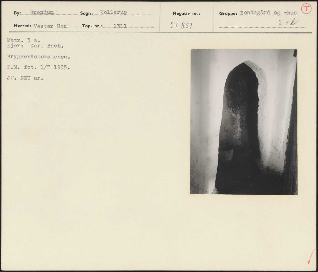 Maskingenkendt tekst fra arkivkort. Matr. 3 a. Hjer: Karl Bach. Bryggersskorstenen, P.M. fot. 1/7 1955. Jf. NEU nr: