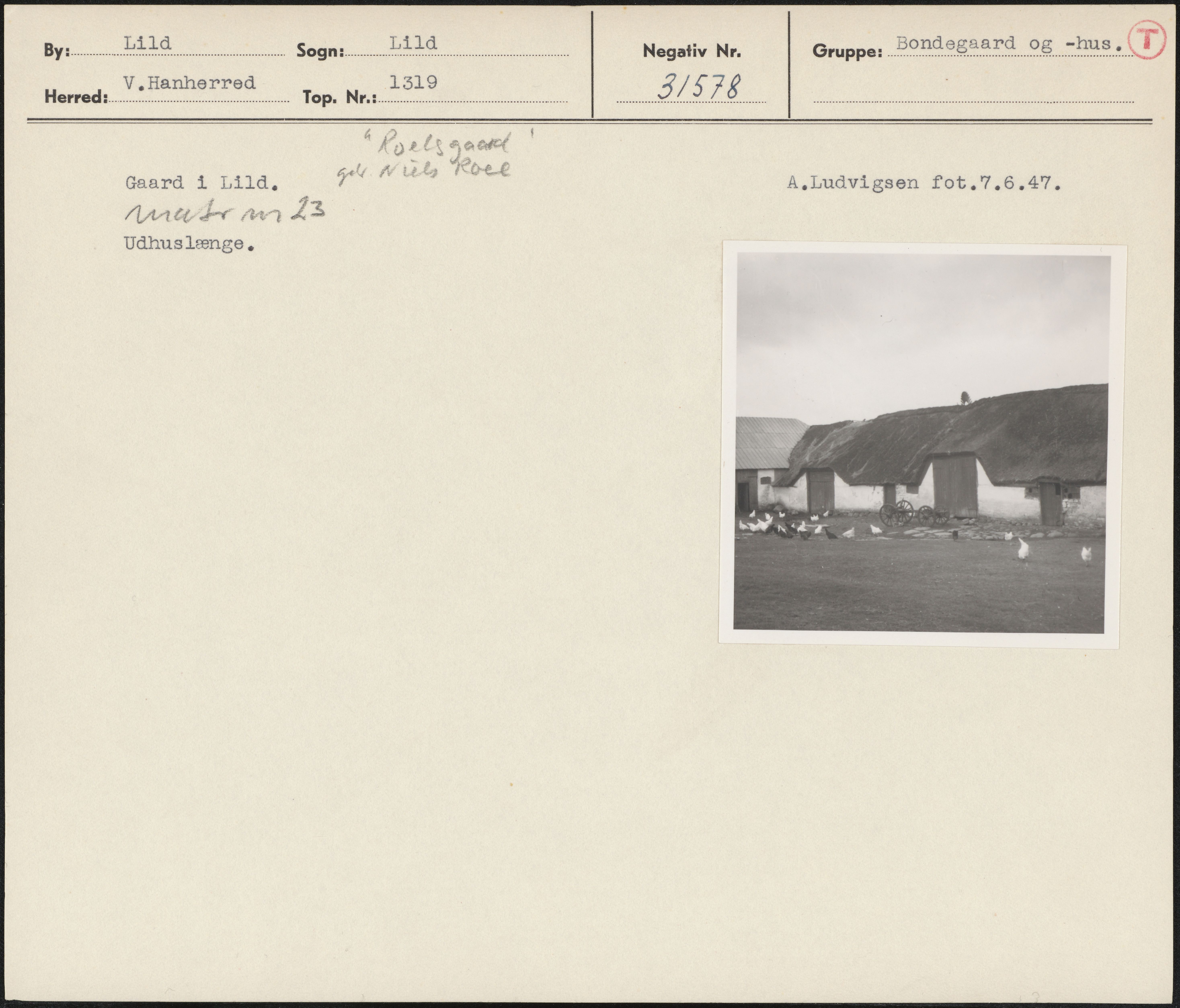 Maskingenkendt tekst fra arkivkort. Horli got p + e Gaard 1 Lild. gå nul KO A.Ludvigsen fot.7.6.47. nmi br ma Å3 Udhuslænge,