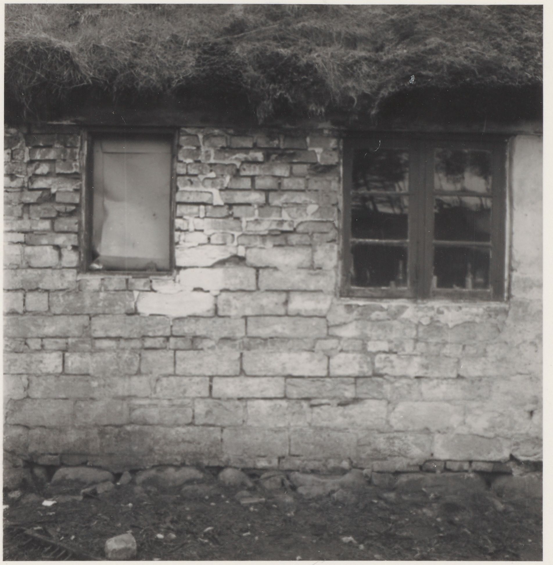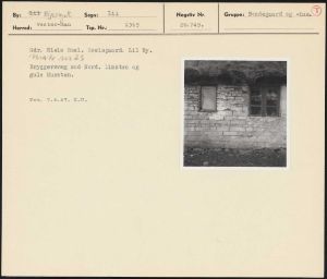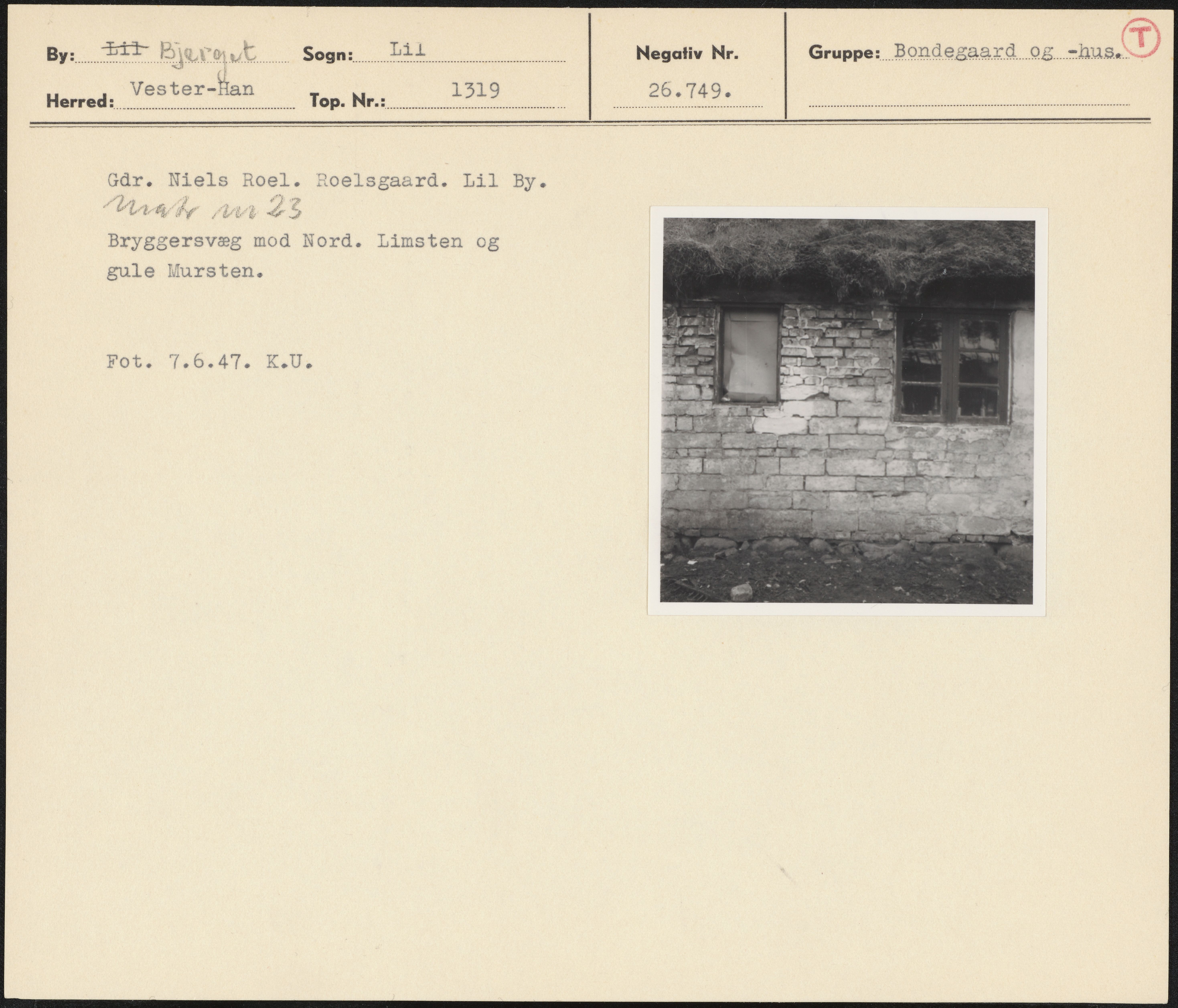 Maskingenkendt tekst fra arkivkort. Går. Niels Roel. Roelsgaard. Lil By. AT fy 6 + Z Bryggersvæg mod Nord. Limsten og gule Mursten. Fot. 7.6.47. K.U.