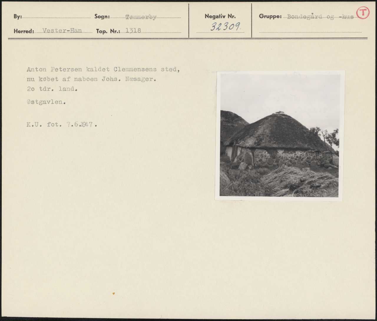 Maskingenkendt tekst fra arkivkort. Anton Petersen kaldet Clemmensens sted, nu købet af naboen Johs. Næsager. 20 tdr. lande Østgavlen. K.U. fot. 7.617 P