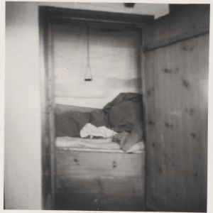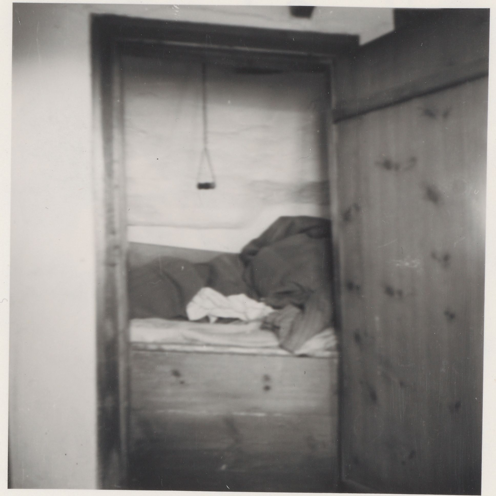 Maskingenkendt tekst fra arkivkort. Anton Petersen, kaldet Cleimensens sted, nu købt af naboen Johs, Næsager. Syd for vejen til Langvad. "Alkove" (lokal betegnelse) i stuen. K.U. fot. 7.6.1947.