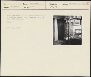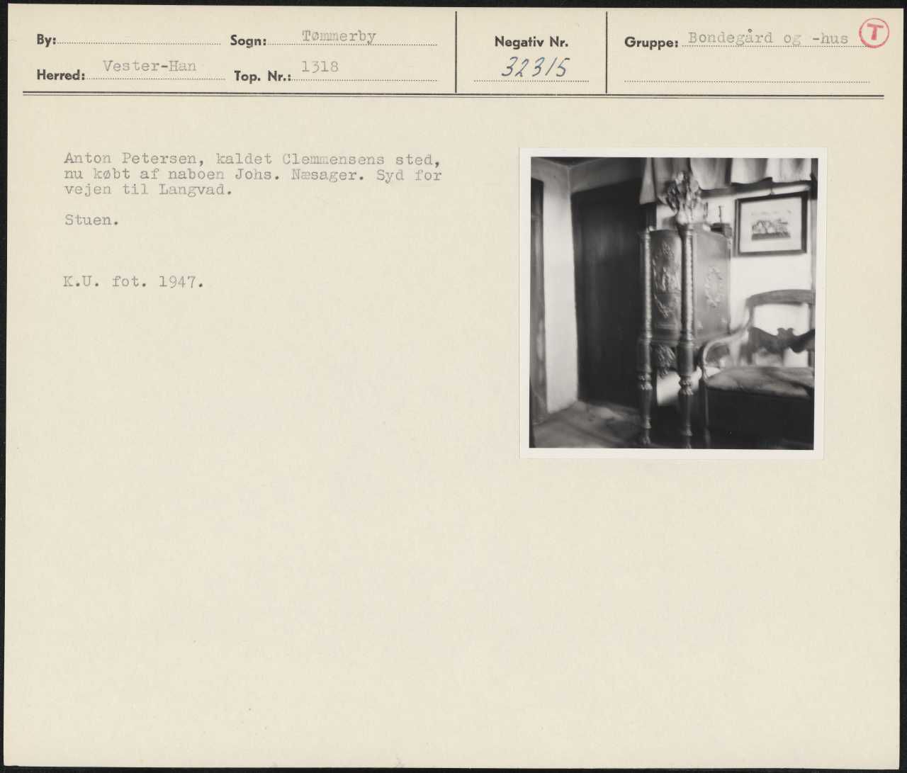 Maskingenkendt tekst fra arkivkort. Anton Petersen, kaldet Clemmensens sted, nu købt af naboen Johs. Næsager. Syd for vejen til Langvad. Stuen. K.U. fot. 1947.