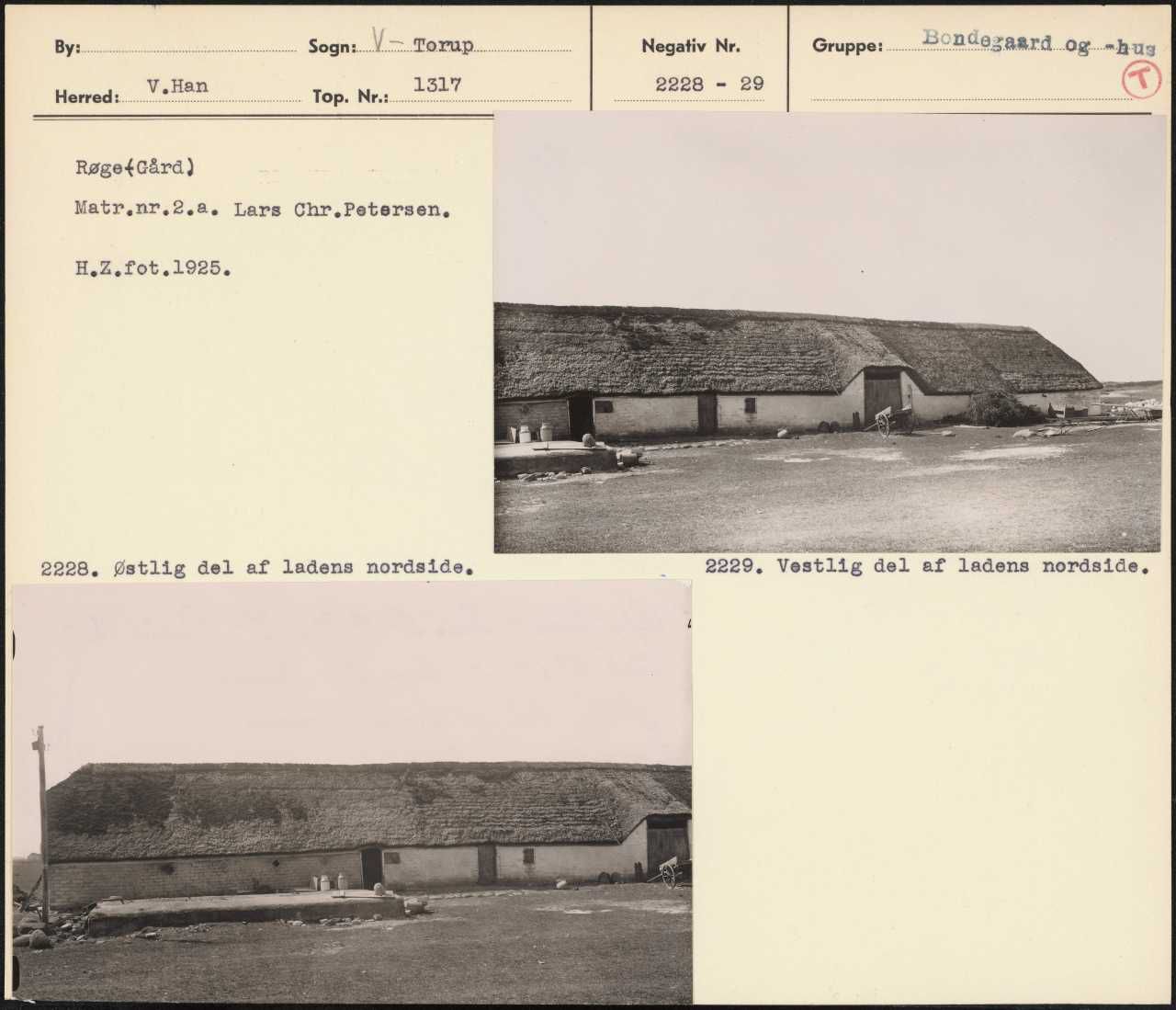 Maskingenkendt tekst fra arkivkort. Røge€4CGård) - Matr.nr.2.8. Lars Chr,Petersen, H.Z.fot.1925. 2228. Østlig del af ladens nordside. 2229, Vestlig del af ladens nordside,