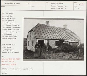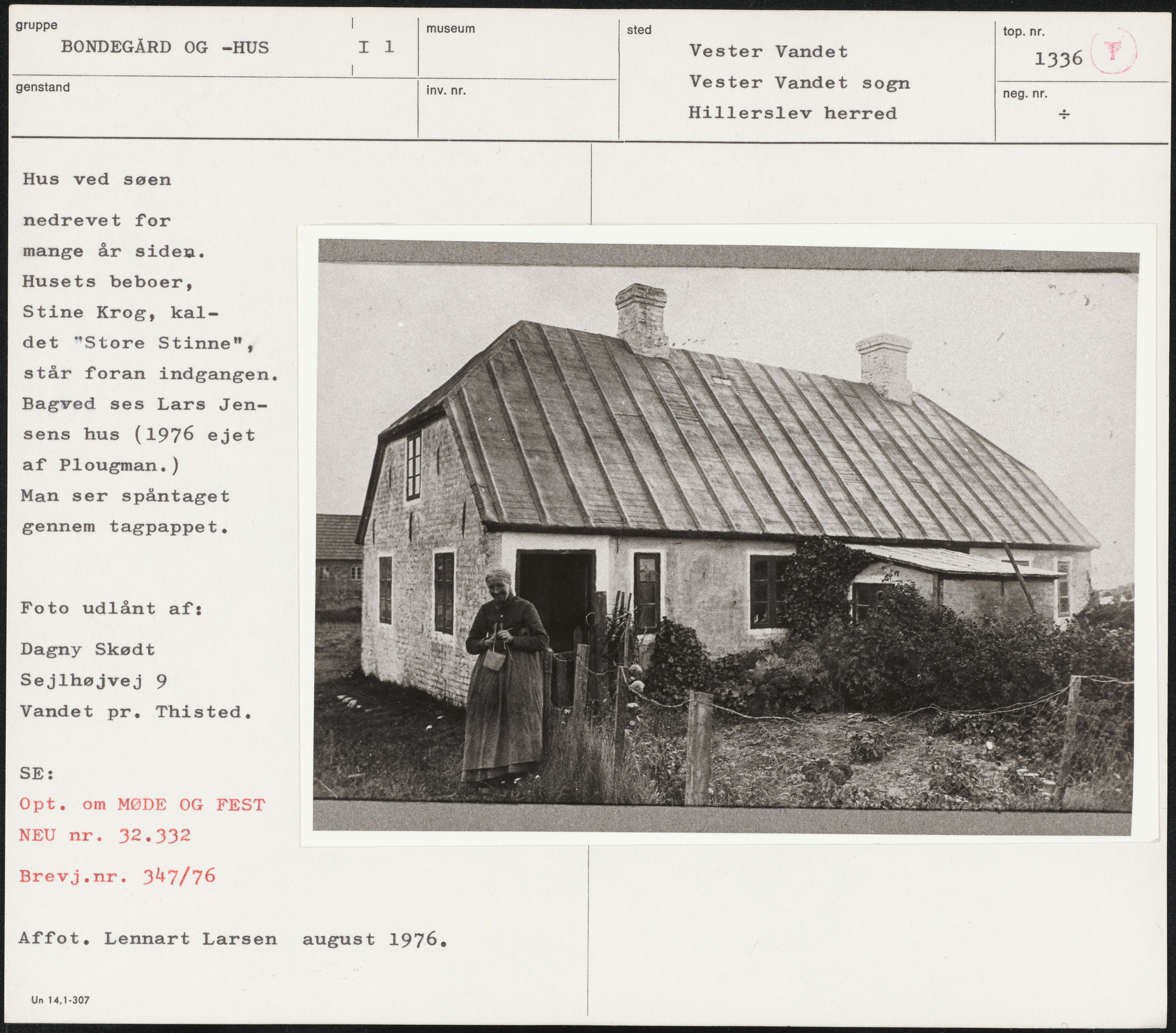 Maskingenkendt tekst fra arkivkort. Hus ved søen nedrevet for mange år siden. Husets beboer, Stine Krog, kal- det "Store Stinne", står foran indgangen. Bagved ses Lars Jen- sens hus (1976 ejet af Plougman) Man ser spåntaget gennem tagpappet. Foto udlånt af: Dagny Skødt Sejlhøjvej 9 Vandet pr. Thisted. SE: Opt. om MØDE OG FEST NEU nr. 32.332 Brevj.nr. 347/76 Affot. Lennart Larsen august 1976, Un 14,1-307