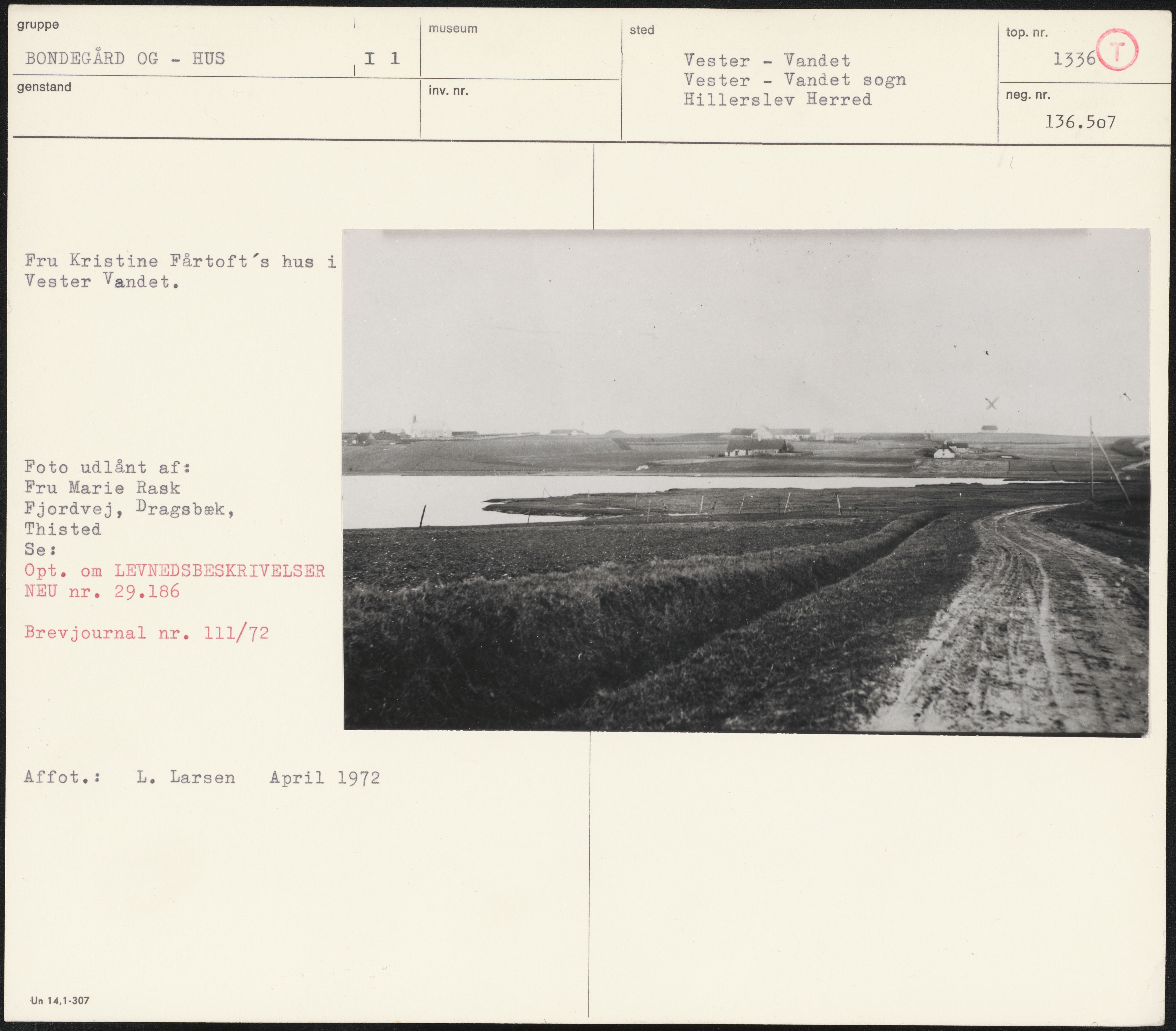 Maskingenkendt tekst fra arkivkort. Fru Kristine Fårtoft”s hus i Vester Vandet. Foto udlånt af: Fru Marie Rask Fjordvej, Dragsbæk, Thisted Se: Opt . om LEVNEDSBESKRIVELSER NEU nr. 29.186 Brevjournal nr. 111/72 Affot: L. Larsen April 1972 Un 14,1-307 ET