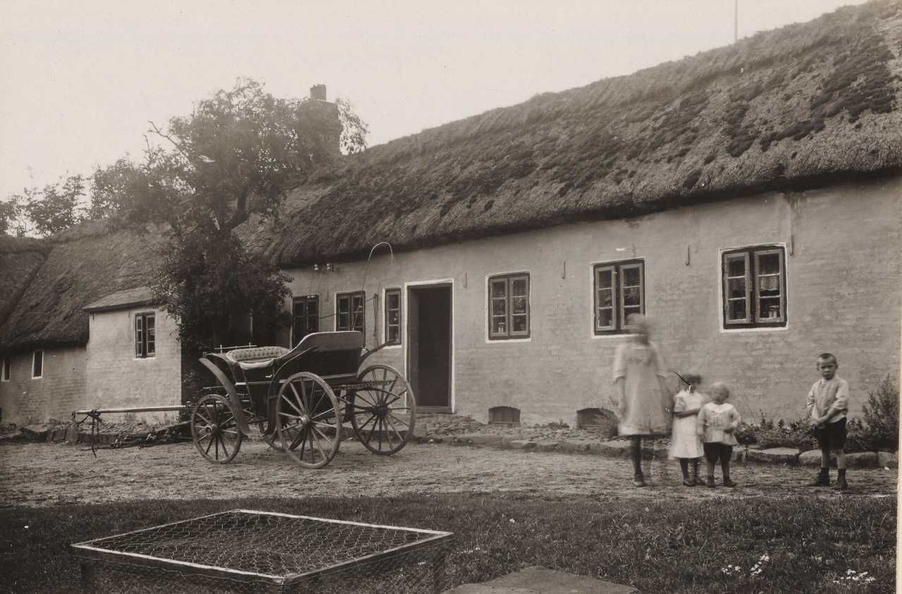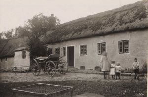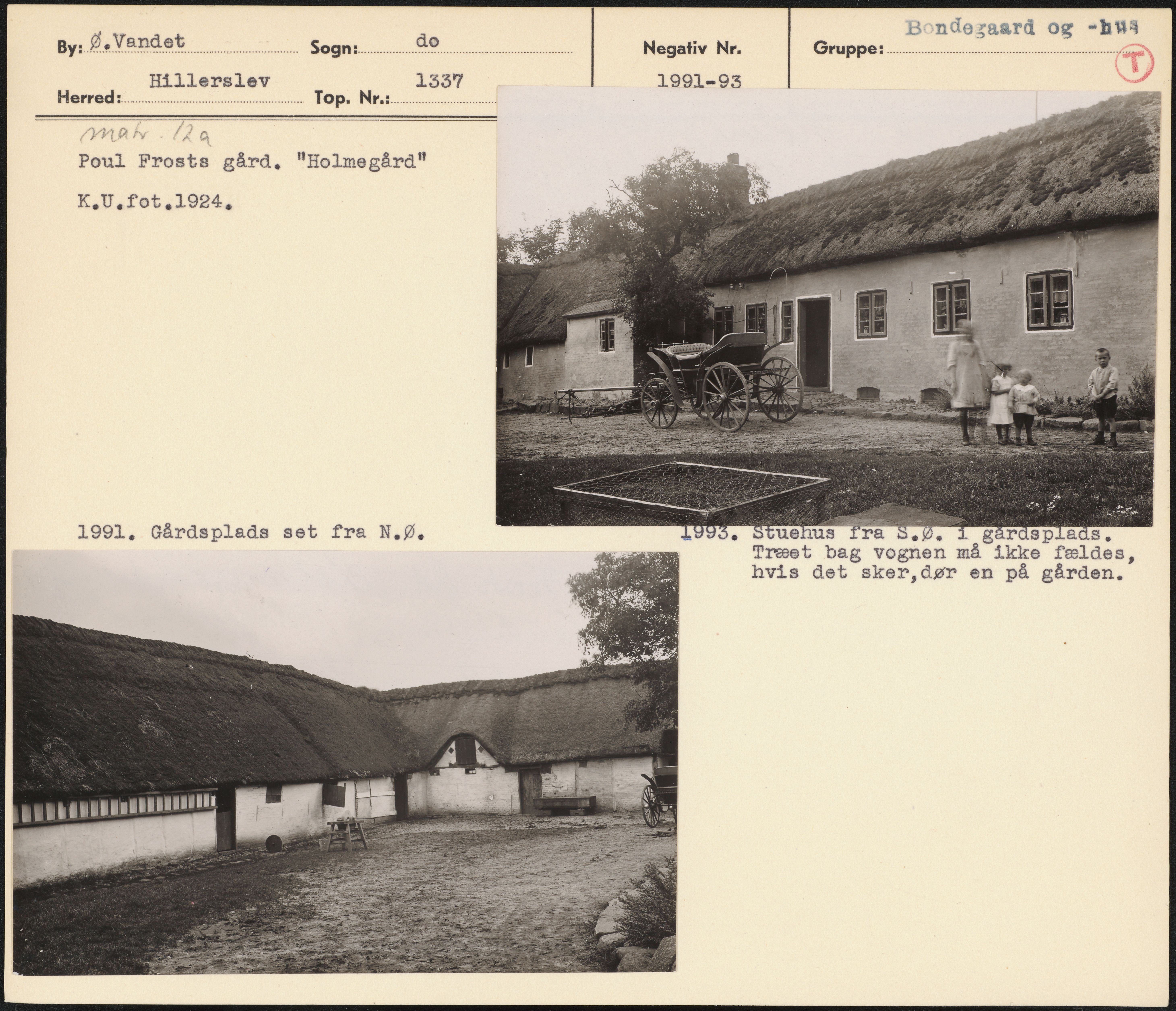 Maskingenkendt tekst fra arkivkort. Ama ( a 2 Poul Frosts gård"Holmegård" K.U.fot ,1924, 1991, Gårdsplads set fra N.Ø. Træet bag vognen må ikke fældes, hvis det sker,dør en på gården.