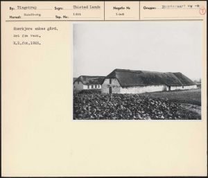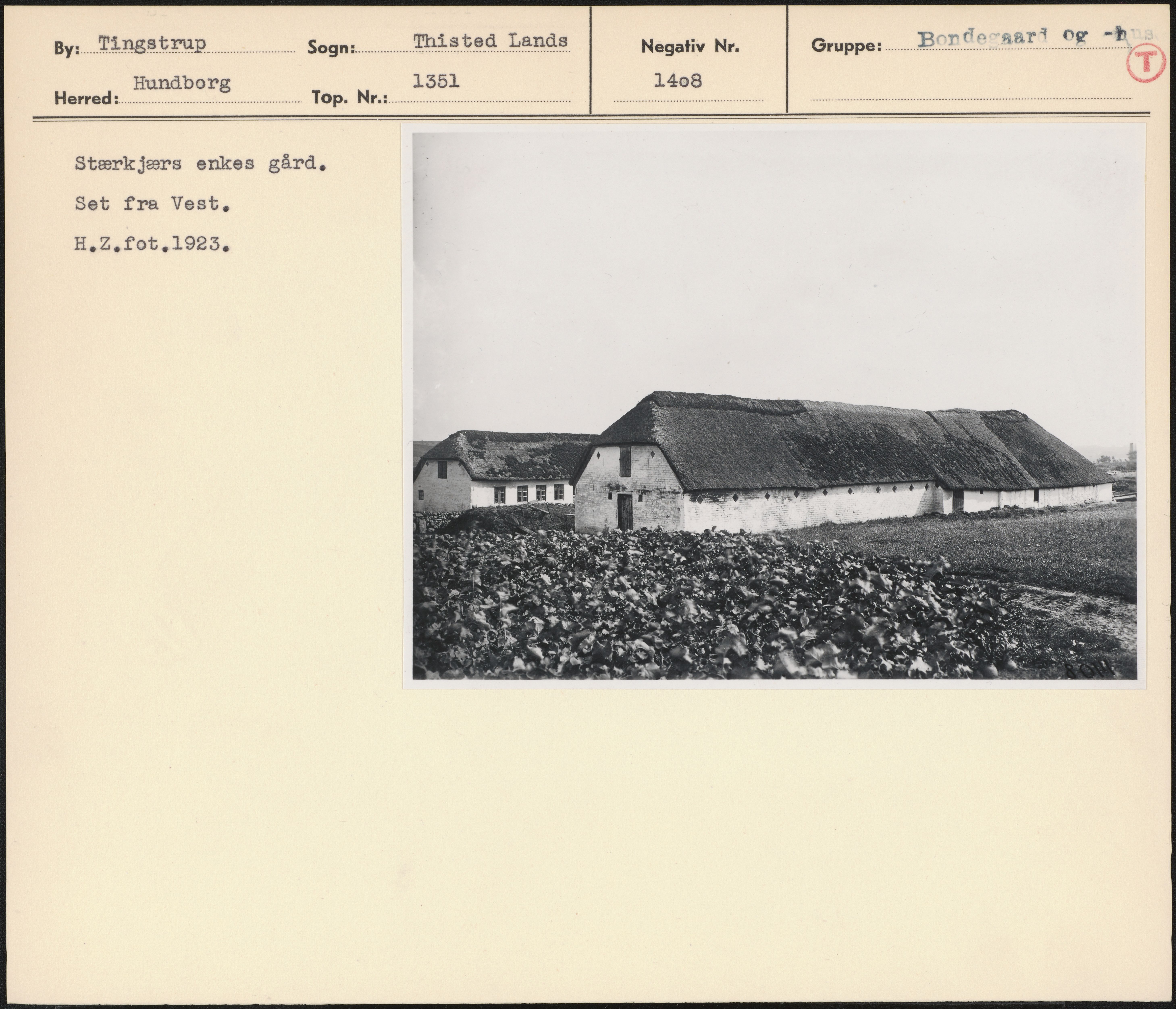 Maskingenkendt tekst fra arkivkort. Stærkjærs enkes gård. Set fra Vest. H.Z.fot,1923.