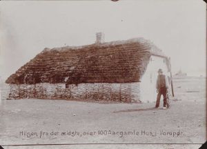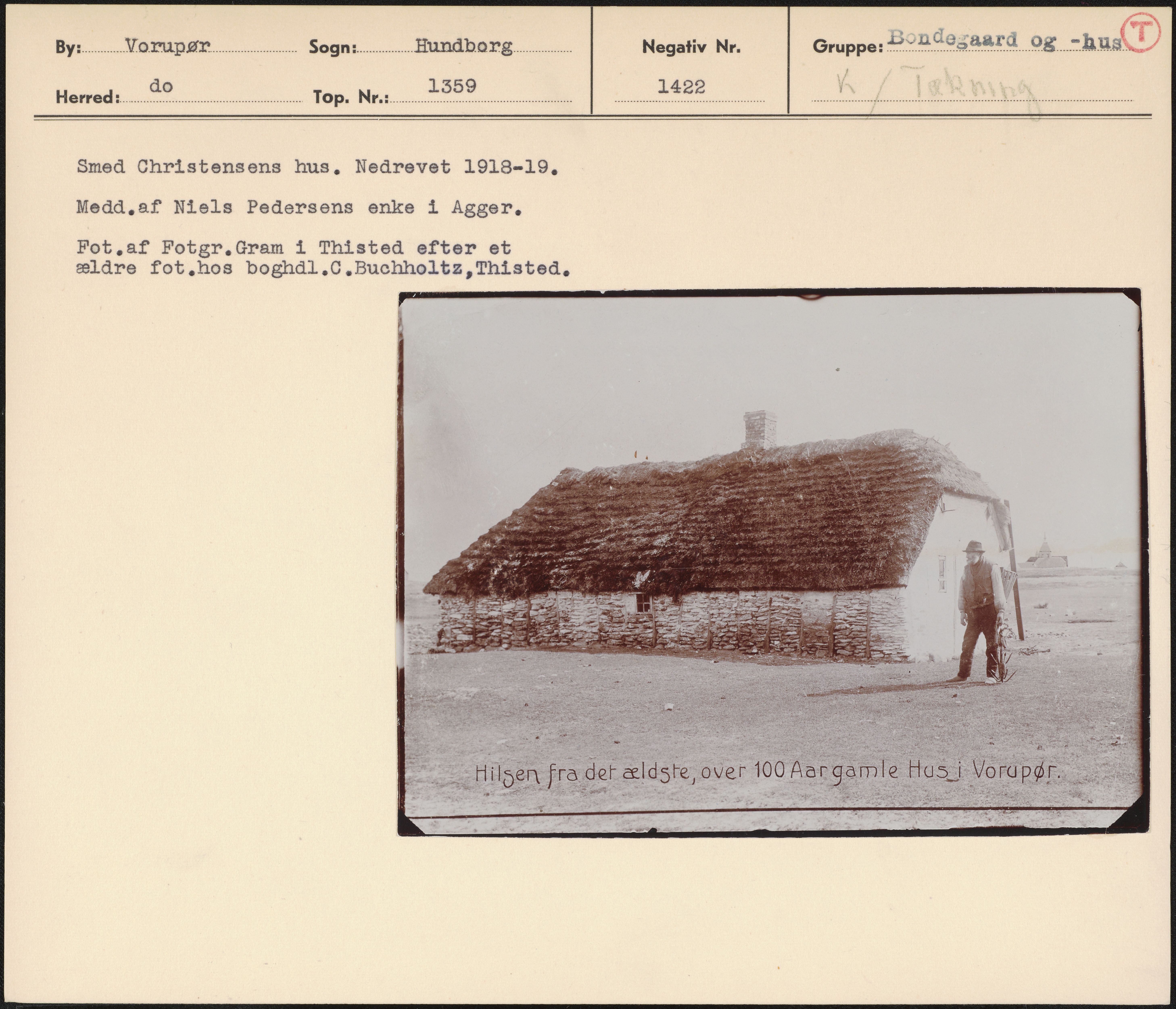 Maskingenkendt tekst fra arkivkort. Smed Christensens hus, Nedrevet 1918-19, Medd af Niels Pedersens enke 1 Agger. Fot,af Fotgr,Gram i Thisted efter et ældre fot,hos boghdl,C.Buchholtz,Thisted,