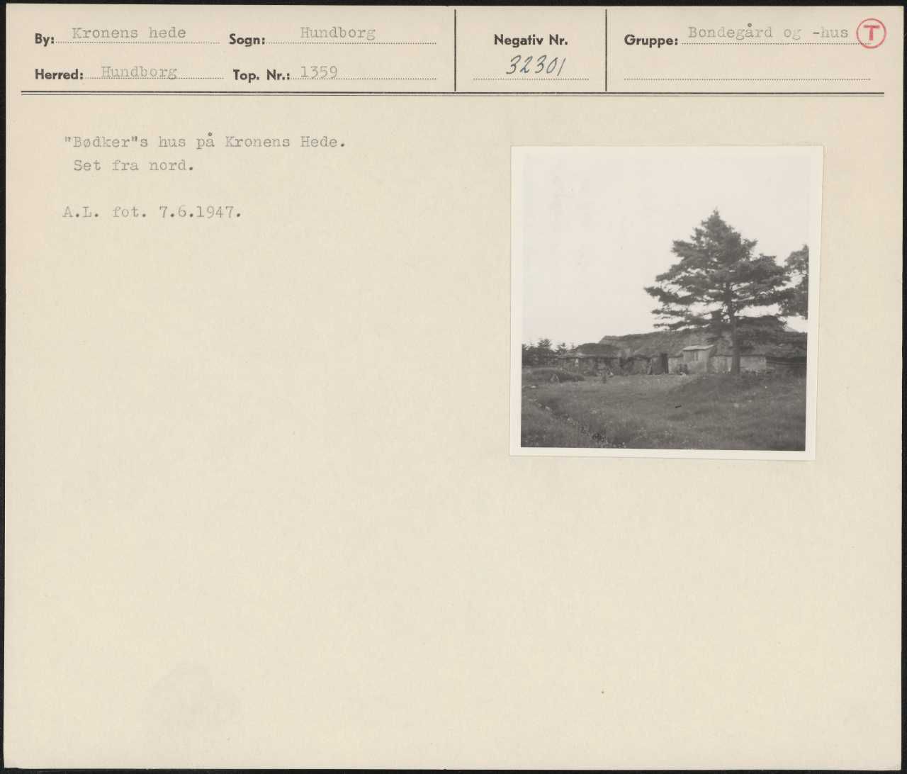 Maskingenkendt tekst fra arkivkort. Bødker"s hus på Kronens Hede. Set fra nord. A.L. fot. 7.6.1947.