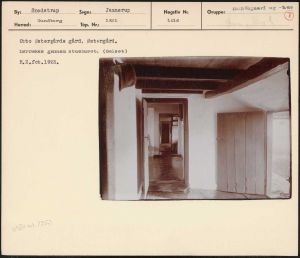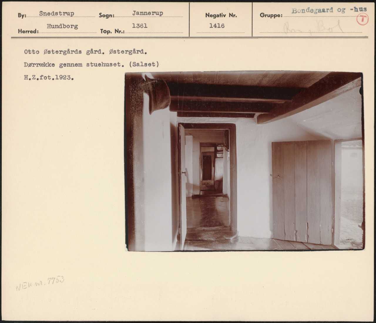 Maskingenkendt tekst fra arkivkort. Otto Østergårds gård, Østergård, Dørrække gennem stuehuset(Salset) H.Z.fot.1923. / T9 HEV WWl. 1750 .