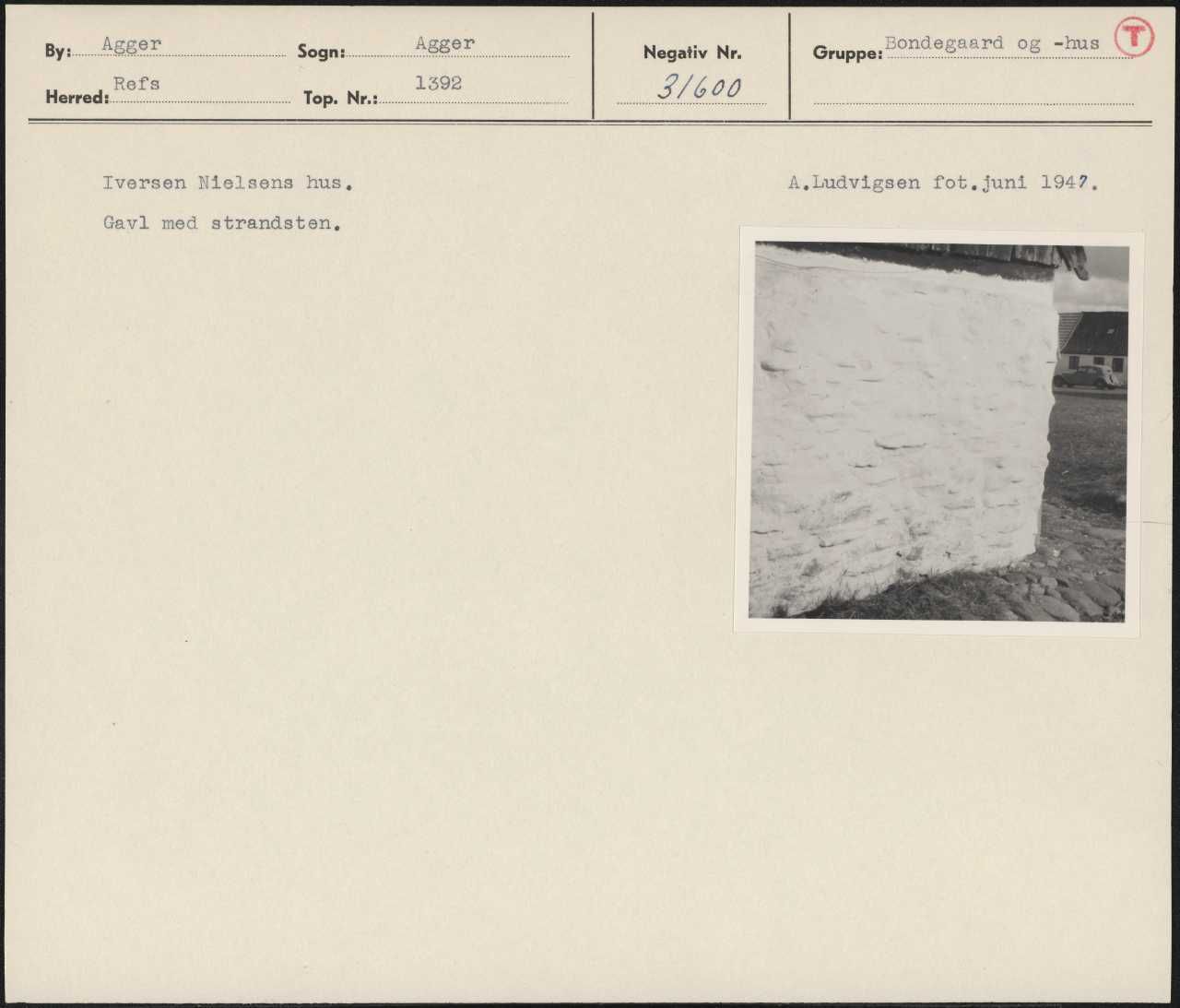 Maskingenkendt tekst fra arkivkort. Iversen Nielsens hus, A.Ludvigsen fot.juni 1947, Gavl med strandsten,