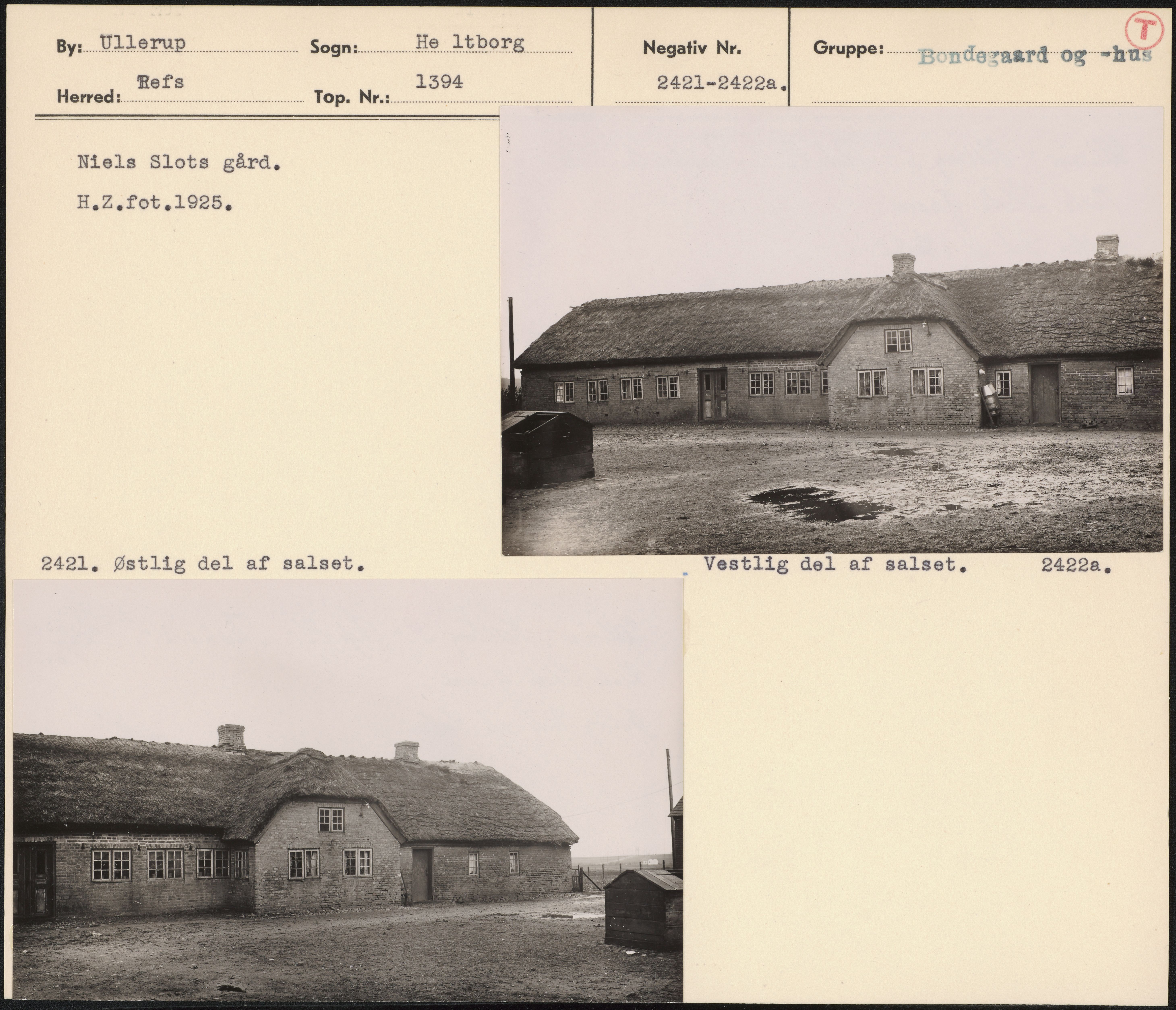 Maskingenkendt tekst fra arkivkort. Niels Slots gård- H.2.fot 1925. - b— Lo rr 2421. Østlig del af salset. Vestlig del af salset, g422a.