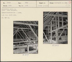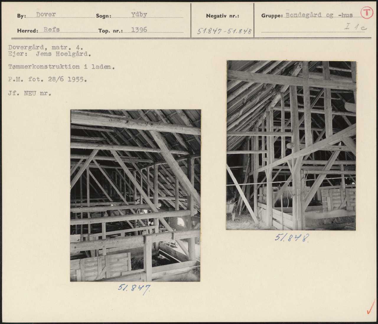 Maskingenkendt tekst fra arkivkort. Dovergård, matr. 4. Hjer: Jens Hoelgård. Tømmerkonstruktion i laden, P.M. fot. 28/6 1955. Jf. NEU nr. 549 57 8Y7.