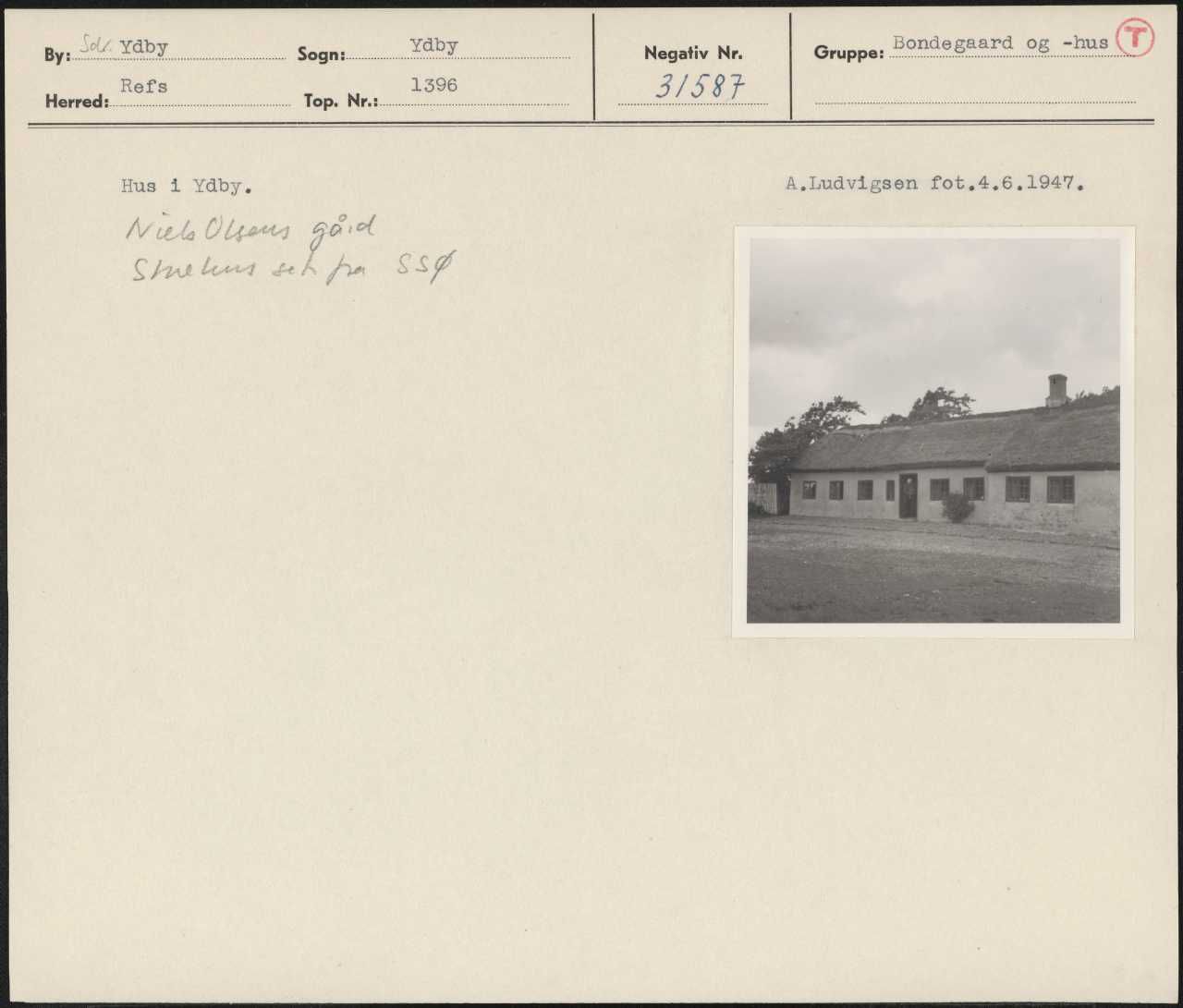 Maskingenkendt tekst fra arkivkort. Hus 1 Ydby. A,Ludvigsen fot.4.6.1947, Nul Ultarg pe Sturt leret ste h fr Ss