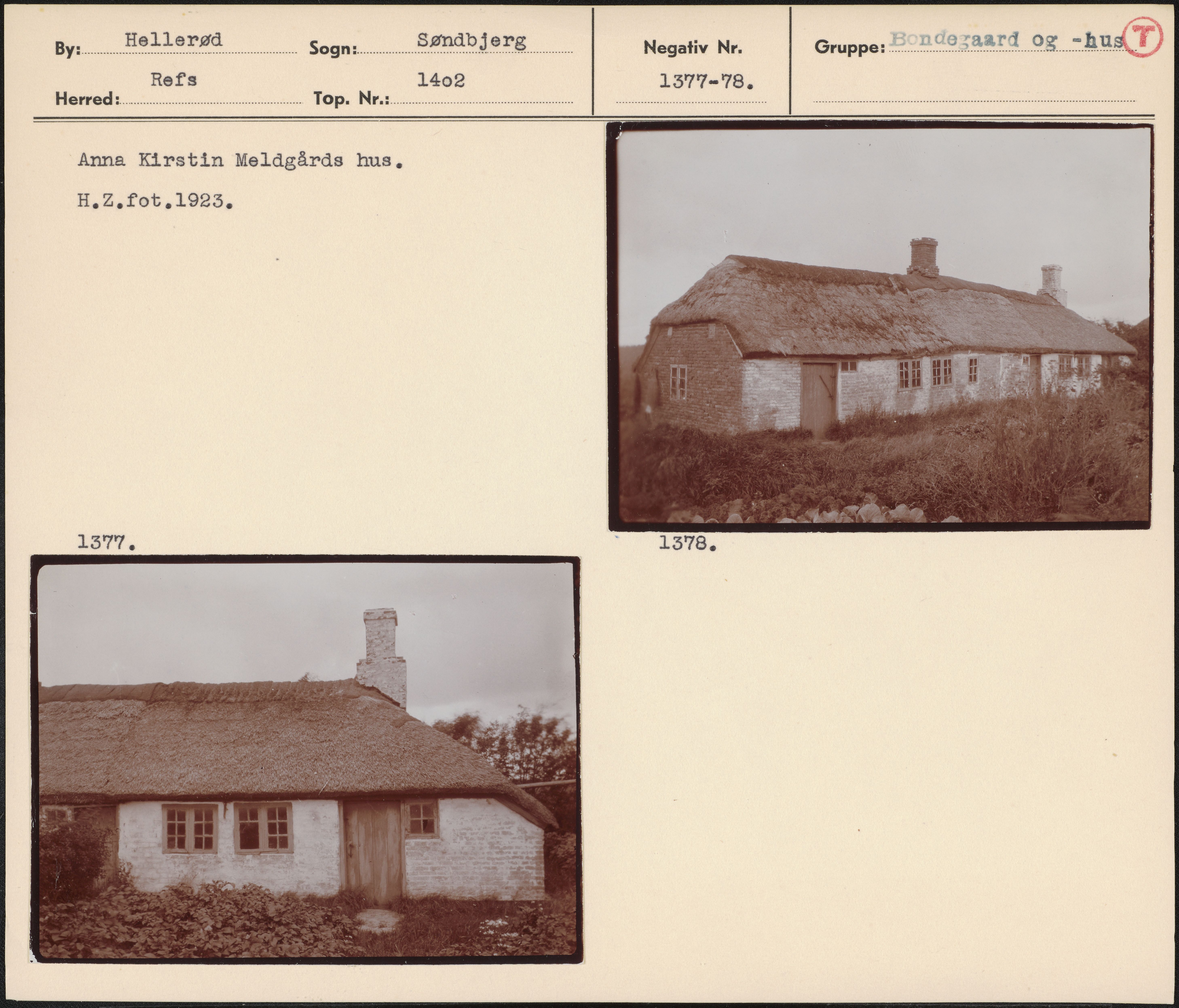 Maskingenkendt tekst fra arkivkort. Anna Kirstin Meldgårds hus, H.Z.fot 1923. 1377. 1378.