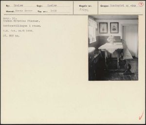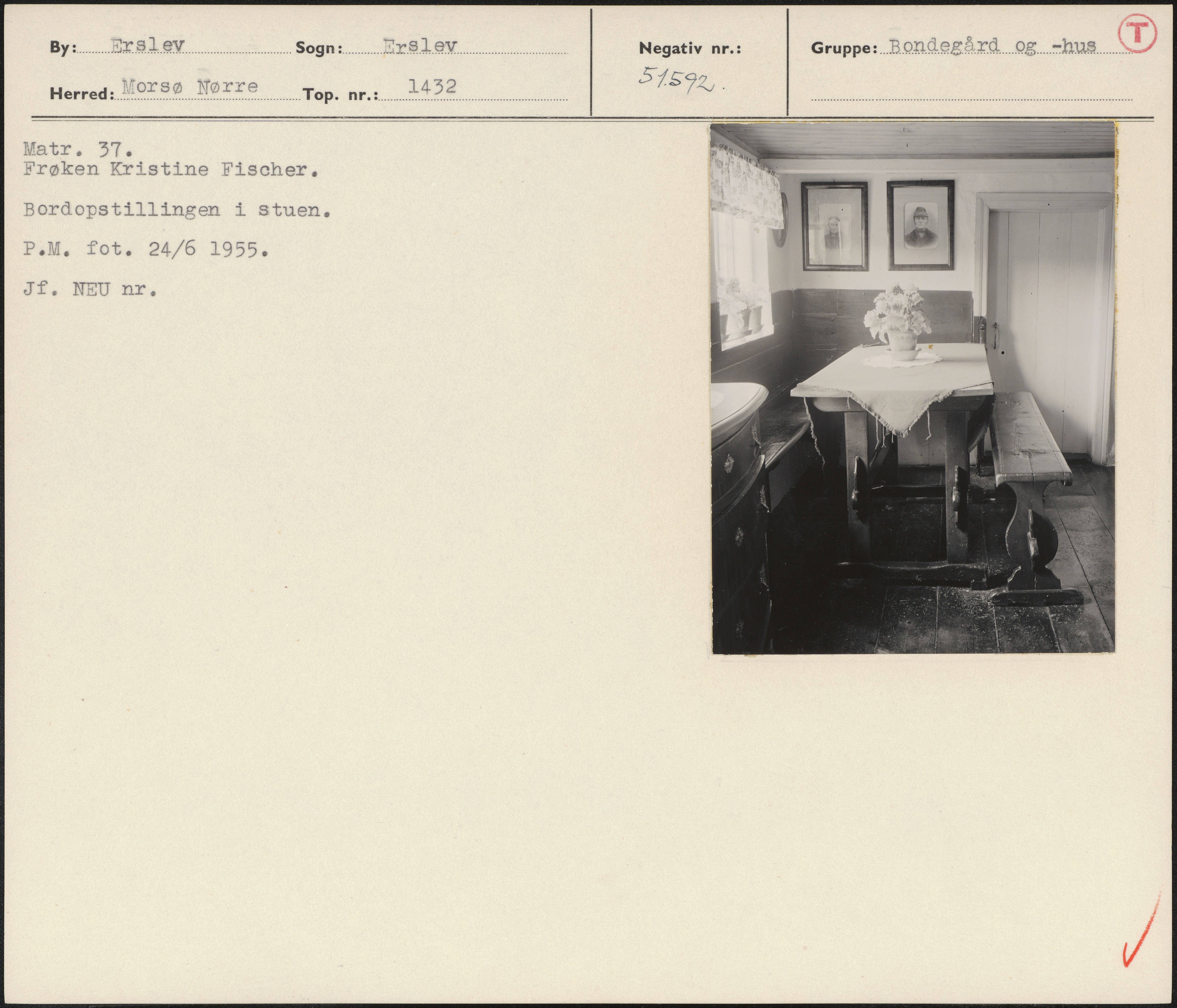 Maskingenkendt tekst fra arkivkort. Matr. 37. Frøken Kristine Fischer. Bordopstillingen i stuen. P.M. fot. 24/6 1955, Jf. NEU nr. : i