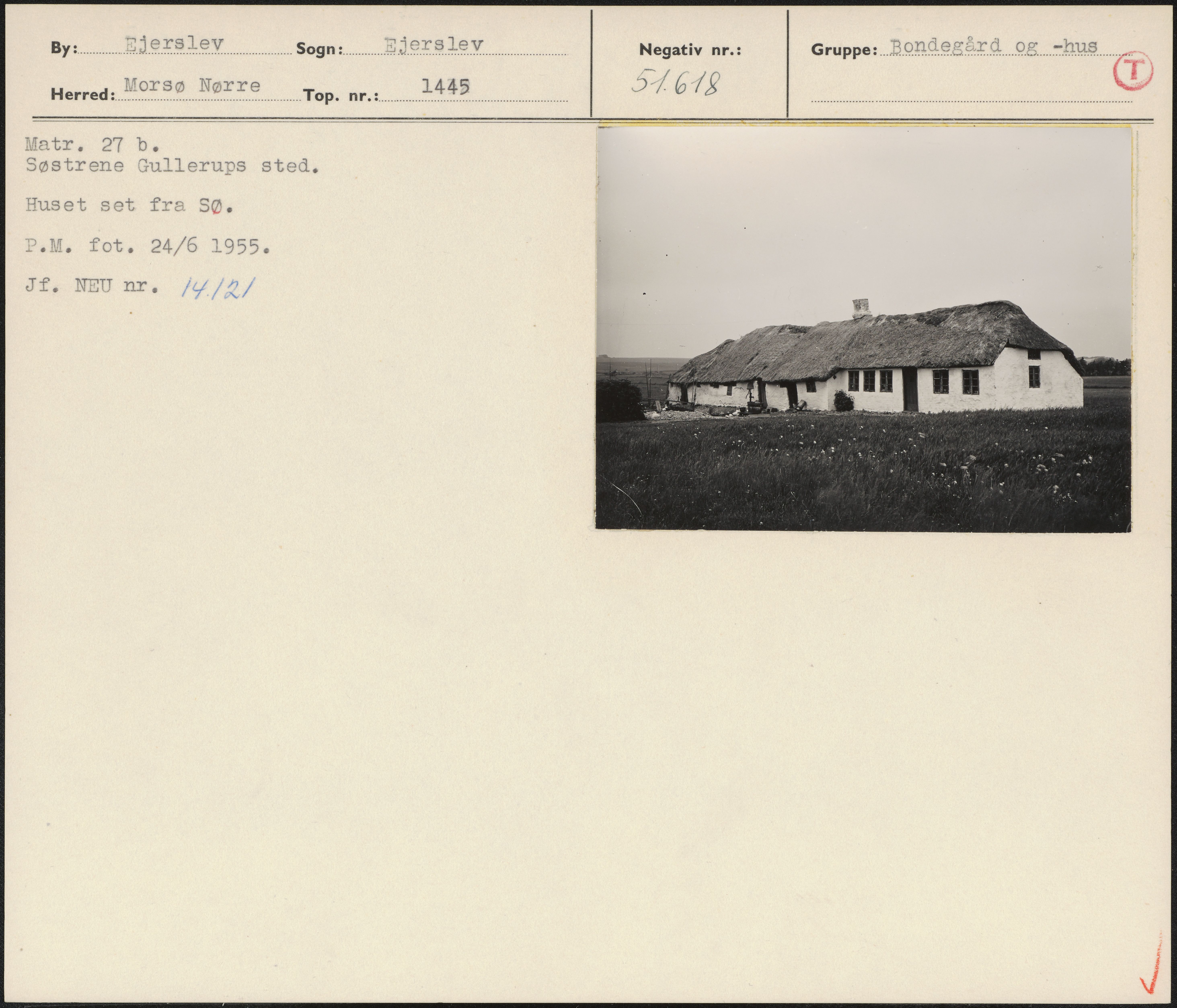 Maskingenkendt tekst fra arkivkort. Matr. 27 b. 1 Søstrene Gullerups sted: Huset set fra SØ: P.M. fot, 24/6 1955, fo- Jf. NEU nr/Y/£- 5 V