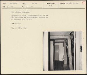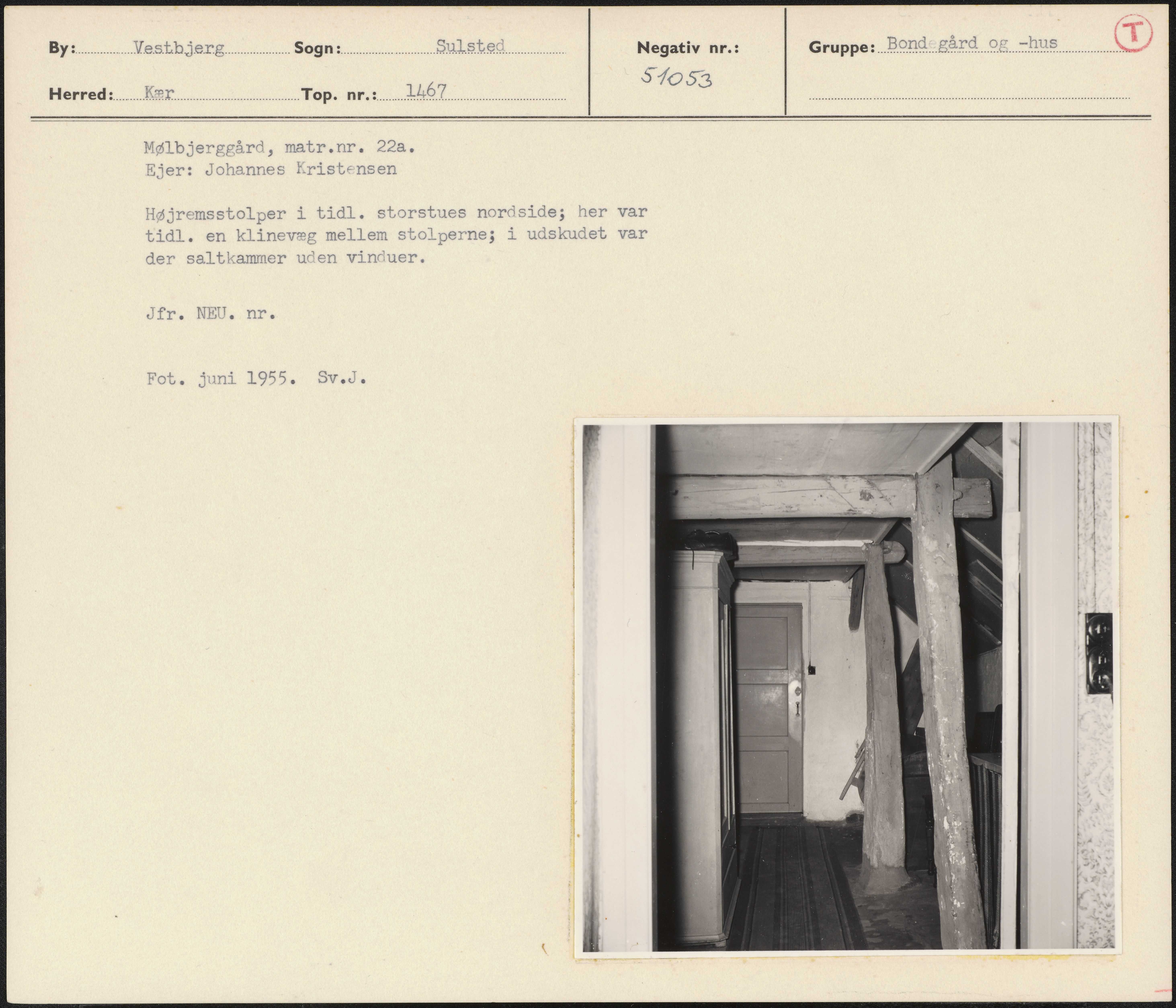 Maskingenkendt tekst fra arkivkort. Mølbjerggård, matr.nr. 22a. Ejer: Johannes Kristensen Højremsstolper i tidl. storstues nordside; her var tidl. en klinevæg mellem stolperne; i udskudet var der saltkammer uden vinduer. Jfr. NEU. nr. ; Fot. juni 1955. Sv.J.
