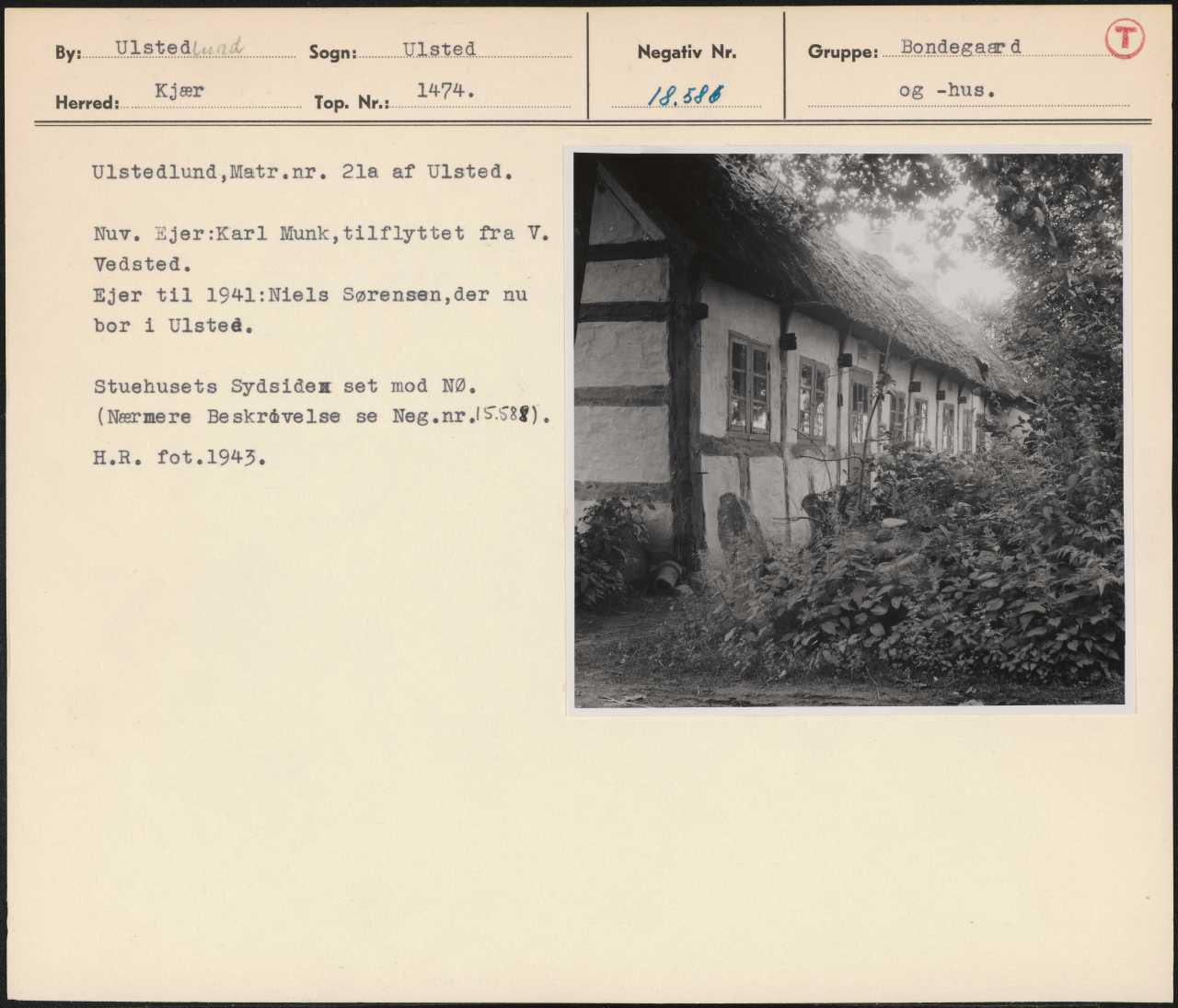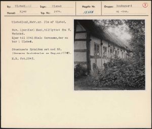 Maskingenkendt tekst fra arkivkort. Ulstedlund,Matr.nr. 2la af Ulsted, Nuv. Ejer:Karl Munk,tilflyttet fra V. Vedsted. Ejer til 1941:Niels Sørensen,der nu bor i Ulsteé, Stuehusets Sydsidem set mod NØ: (Nærmere Beskråvelse se Neg.nr!SS3f). H.R. fot.19453,