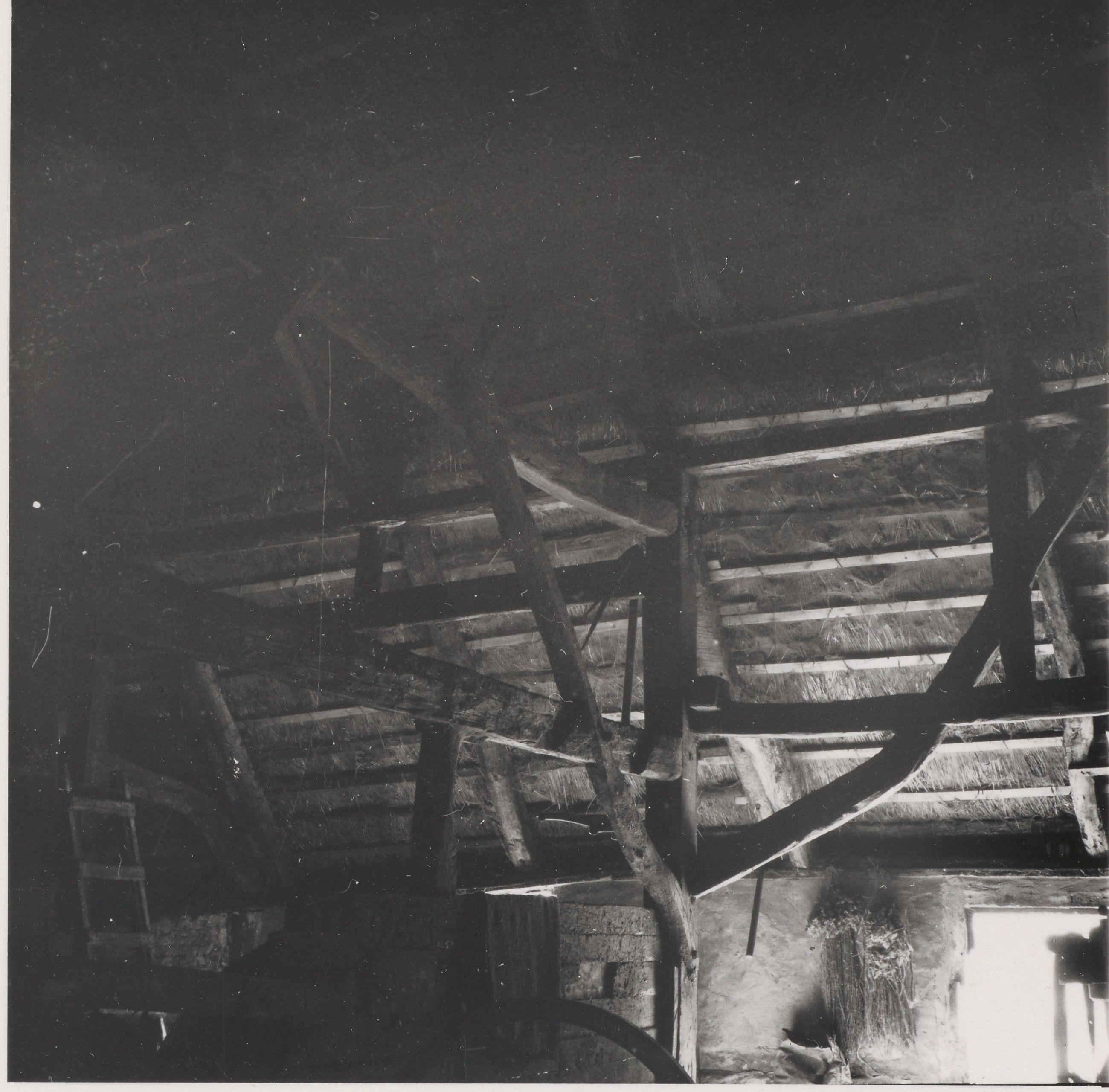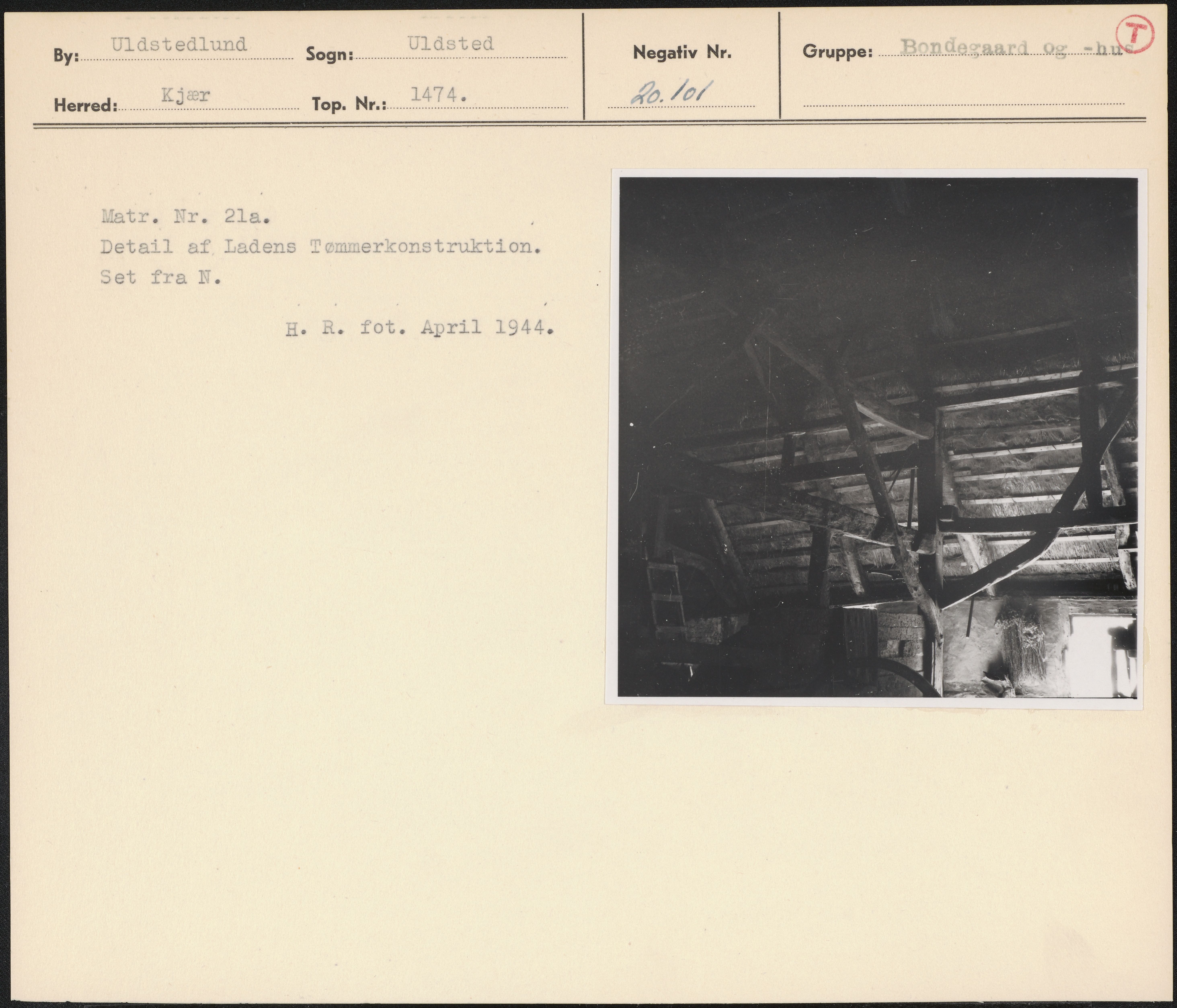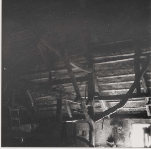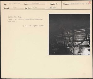 Maskingenkendt tekst fra arkivkort. Matr. Nr?la. Detail af Ladens Tømmerkonstruktion. Set fra N. H. R. fot. April 1944.