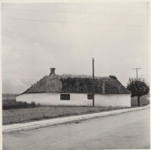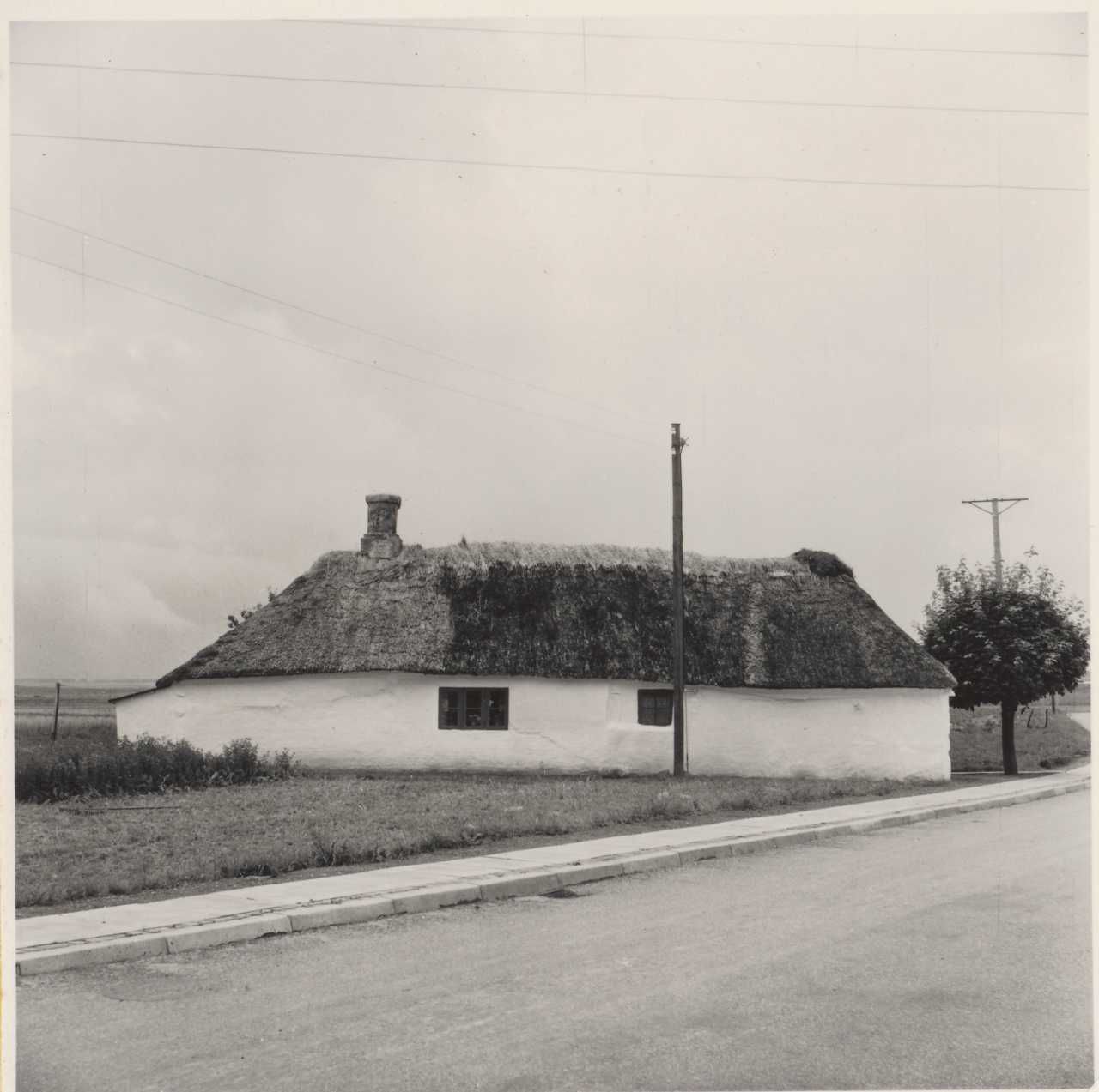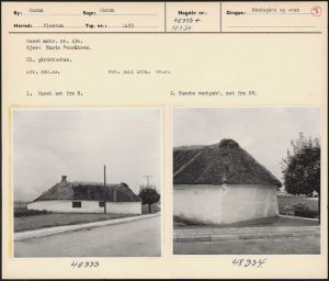 Maskingenkendt tekst fra arkivkort. . Huset matr. nr. 43a. Ejer: Marie Henriksen. G1. gårdstuehus. Jfr. NEU.nr. Fot. juli 1954. Sv.J. 1. Huset set fra N. 2. Husets vestgavl, set fra NV. L/6 352 TS D3 4