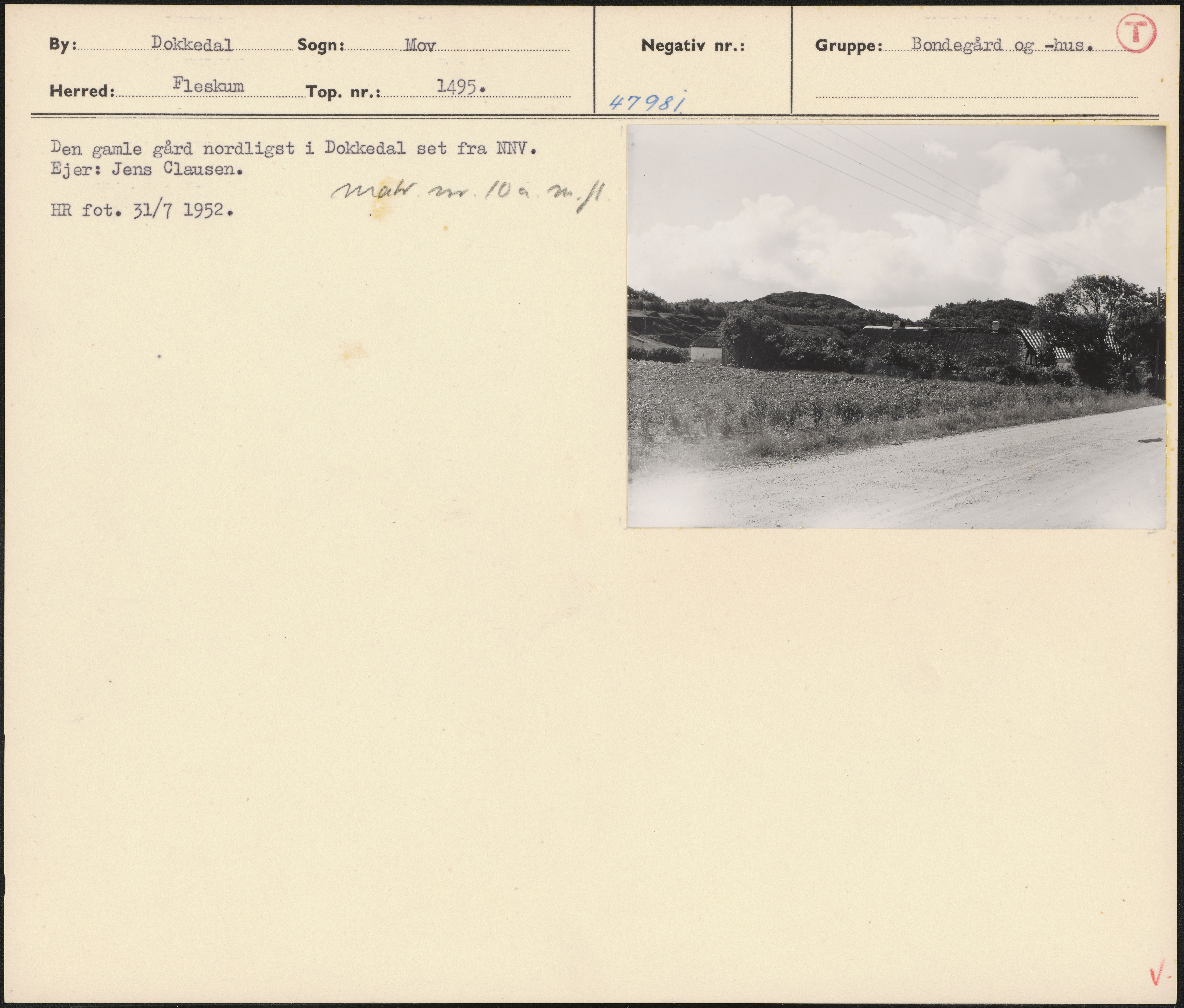 Maskingenkendt tekst fra arkivkort. Den gamle gård nordligst i Dokkedal set fra NNV. Ejer: Jens Clausen. am ar 168 WS HR fot 31/7 1952. L