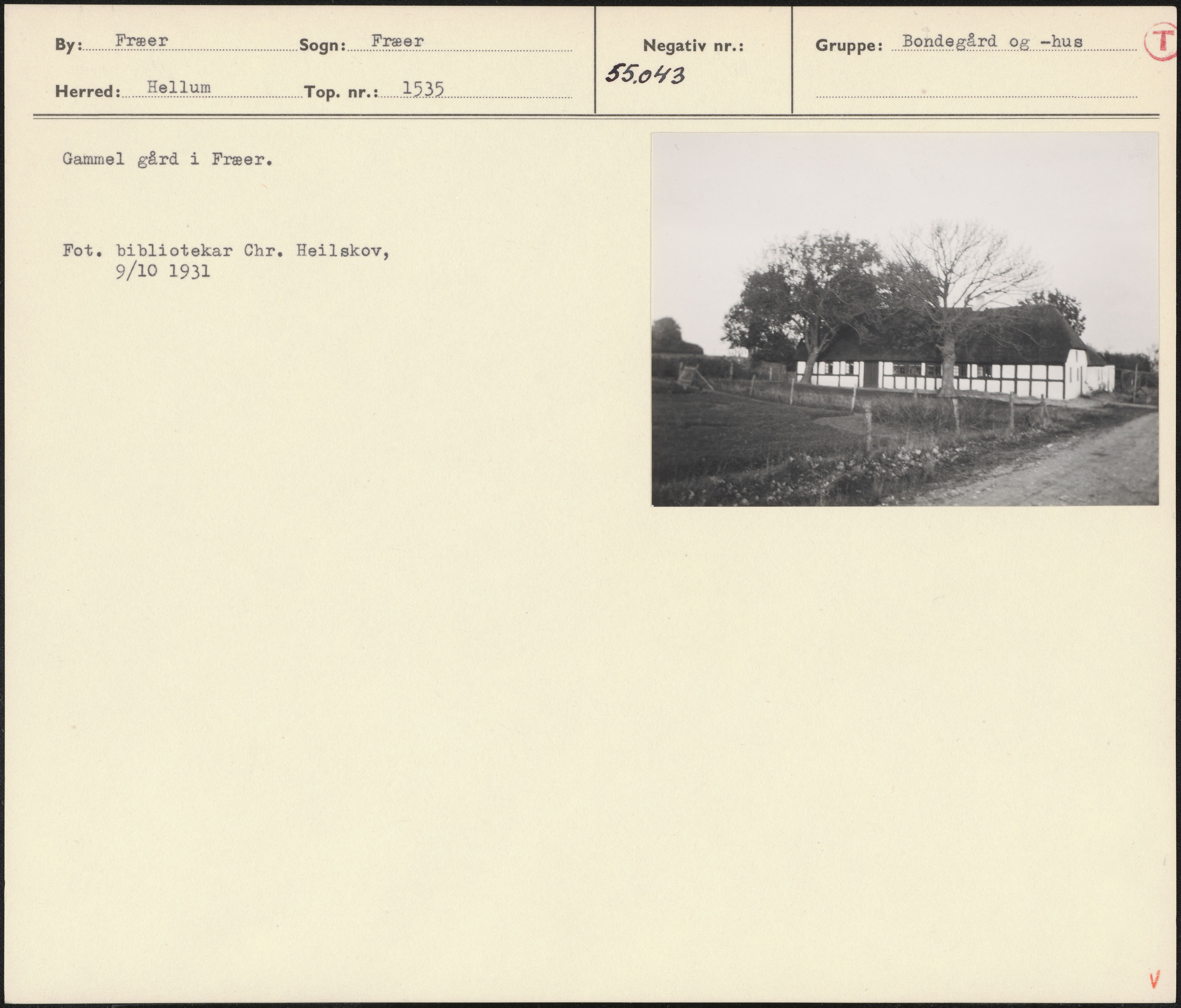 Maskingenkendt tekst fra arkivkort. Gammel gård i Fræer. Fot. bibliotekar Chr. Heilskov, 9/10 1931