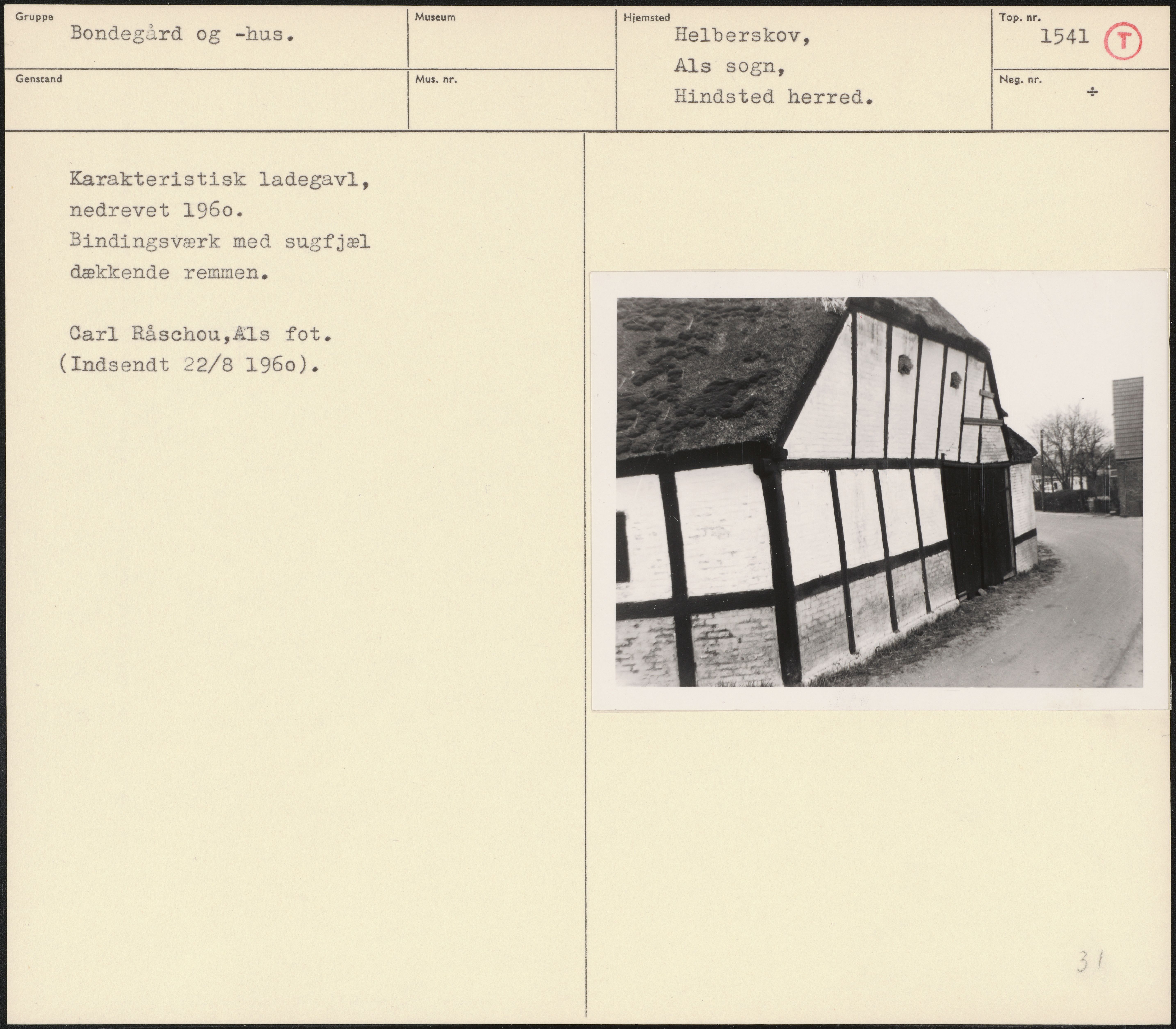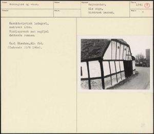 Maskingenkendt tekst fra arkivkort. Karakteristisk ladegavl, nedrevet 1960. Bindingsværk med sugfjæl dækkende remmen. Carl Råschou,ÆAls fot. (Indsendt 22/8 1960). et