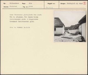 Maskingenkendt tekst fra arkivkort. Arne Sørensens gårdsplads fra nord. : Til v. stuehus. Til højre Søren Christensens gård. I baggrunden Leonhard Christensens gård. fot. K. Uldall 31.5.52