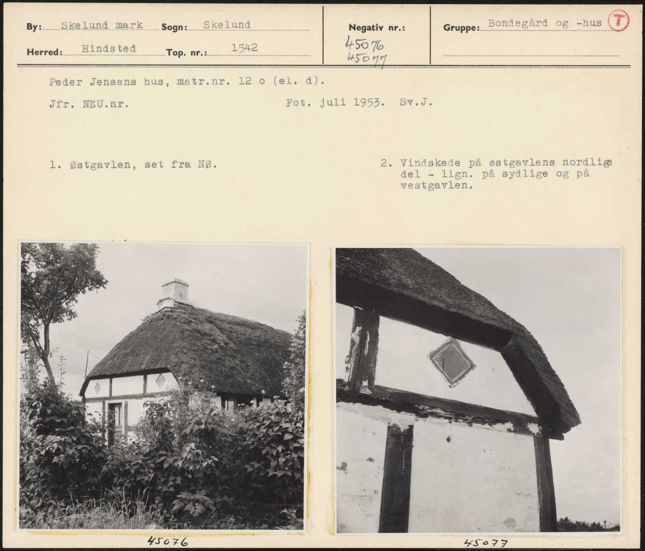 Maskingenkendt tekst fra arkivkort. Peder Jensens hus, matr.nr. 12 o (el. 4). Jfr. NEU.nr- Fot. juli 1955. BSv.J. 1. Østgavlen, set fra NØ. 2. Vindskede på østgavlens nordliæ del - lign. på sydlige og på vestgavlen. 45076 - …— Ls o77F7