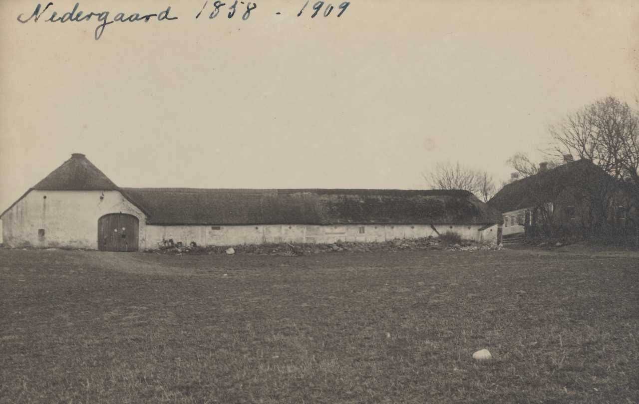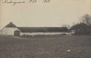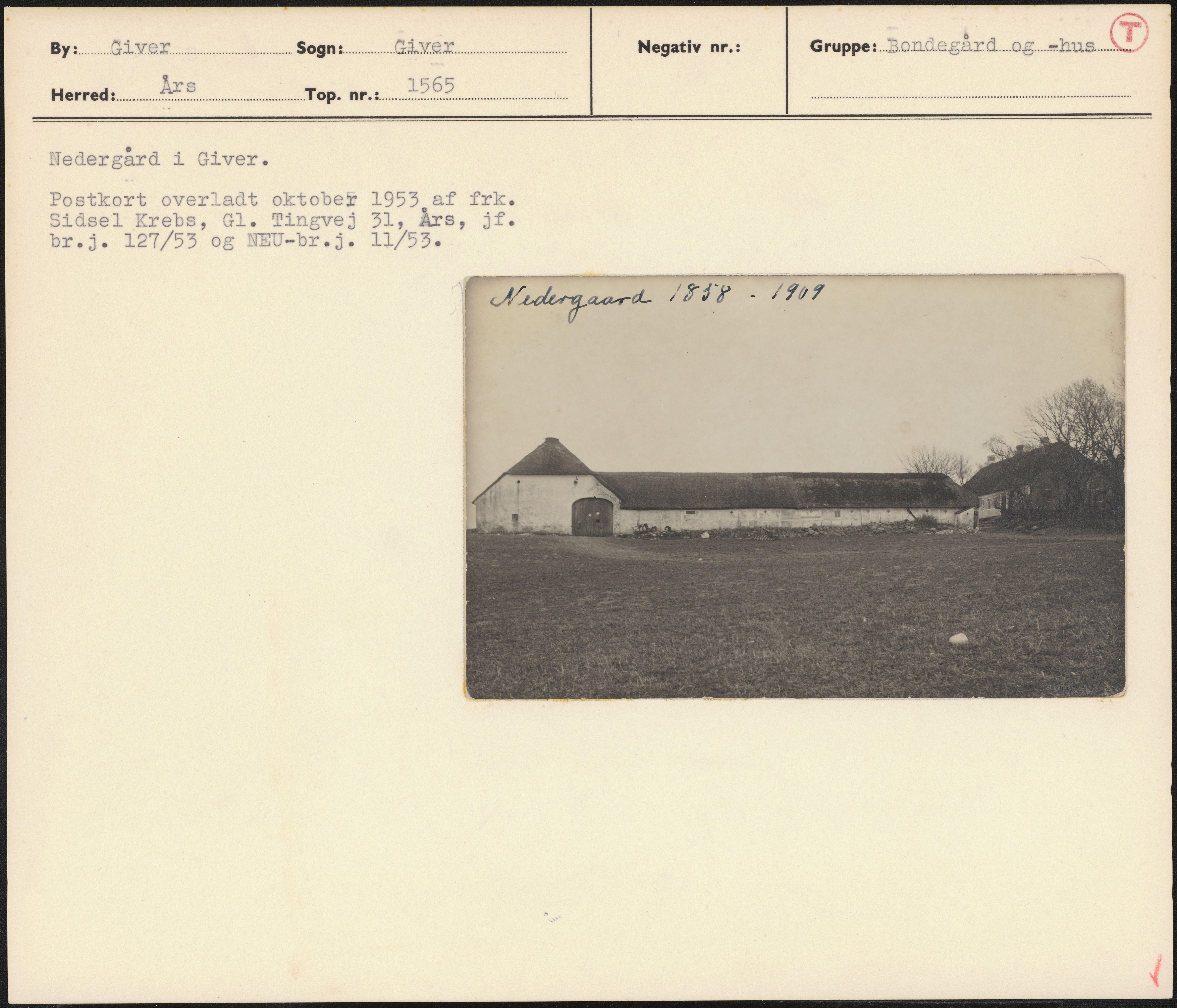 Maskingenkendt tekst fra arkivkort. Nedergård i Giver. Postkort overladt oktober 1953 af frk. Sidsel Krebs, G1. Tingvej 31, Års, jf.
