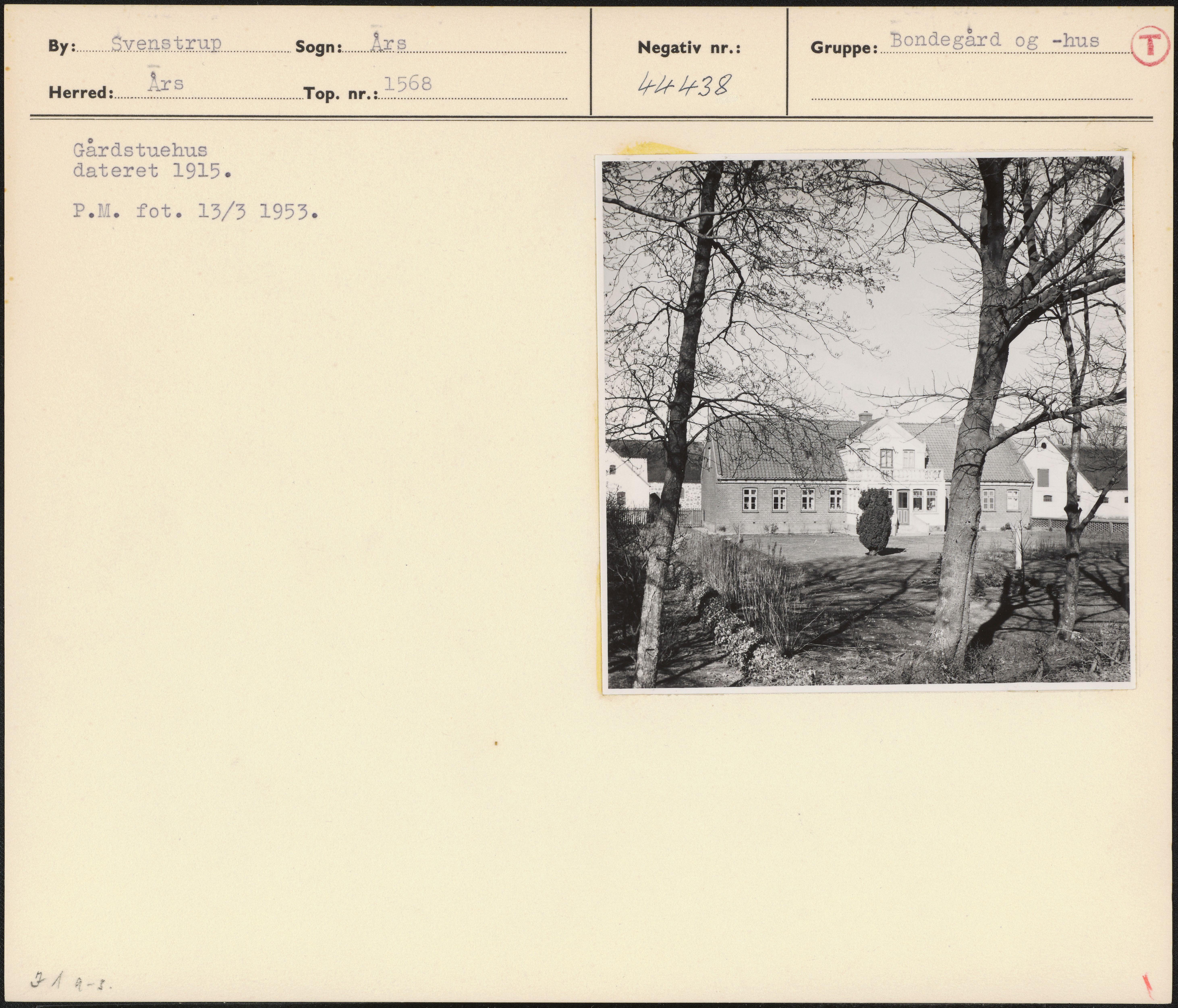 Maskingenkendt tekst fra arkivkort. Gårdstuehus dateret 1915. P.M. fot. 13/3 1953. FÅ ar. V