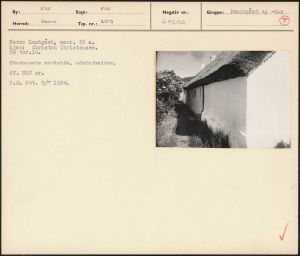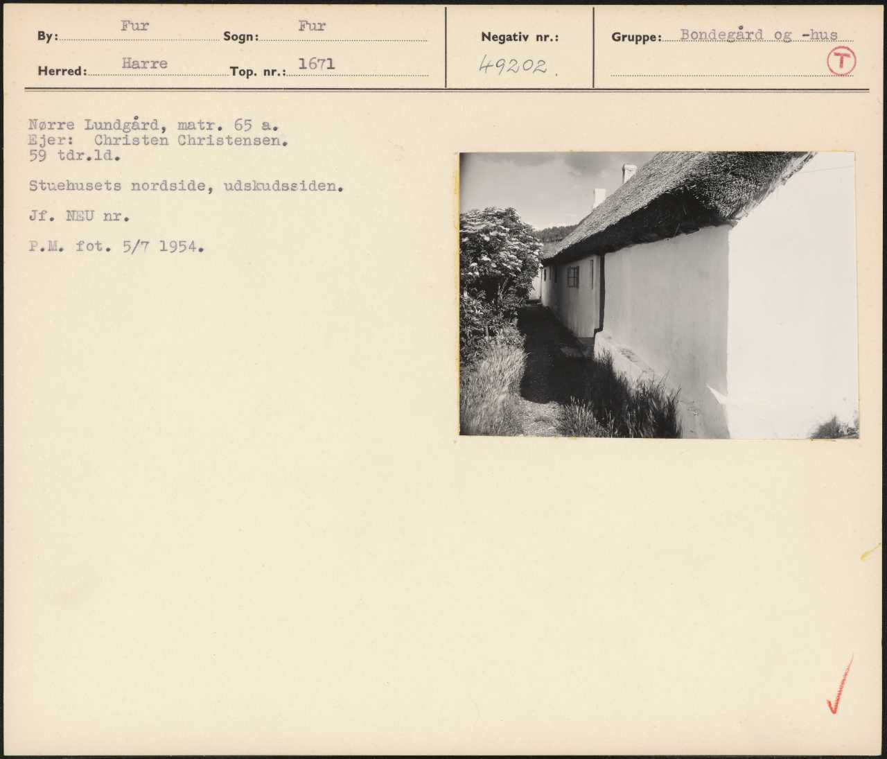 Maskingenkendt tekst fra arkivkort. Nørre Lundgård, matr. 65 a. Ejer: Christen Christensen. 59 tdr.lde Stuehusets nordside, udskudssidene Jf. NEU nre P.M. fot. 5/T 1954.