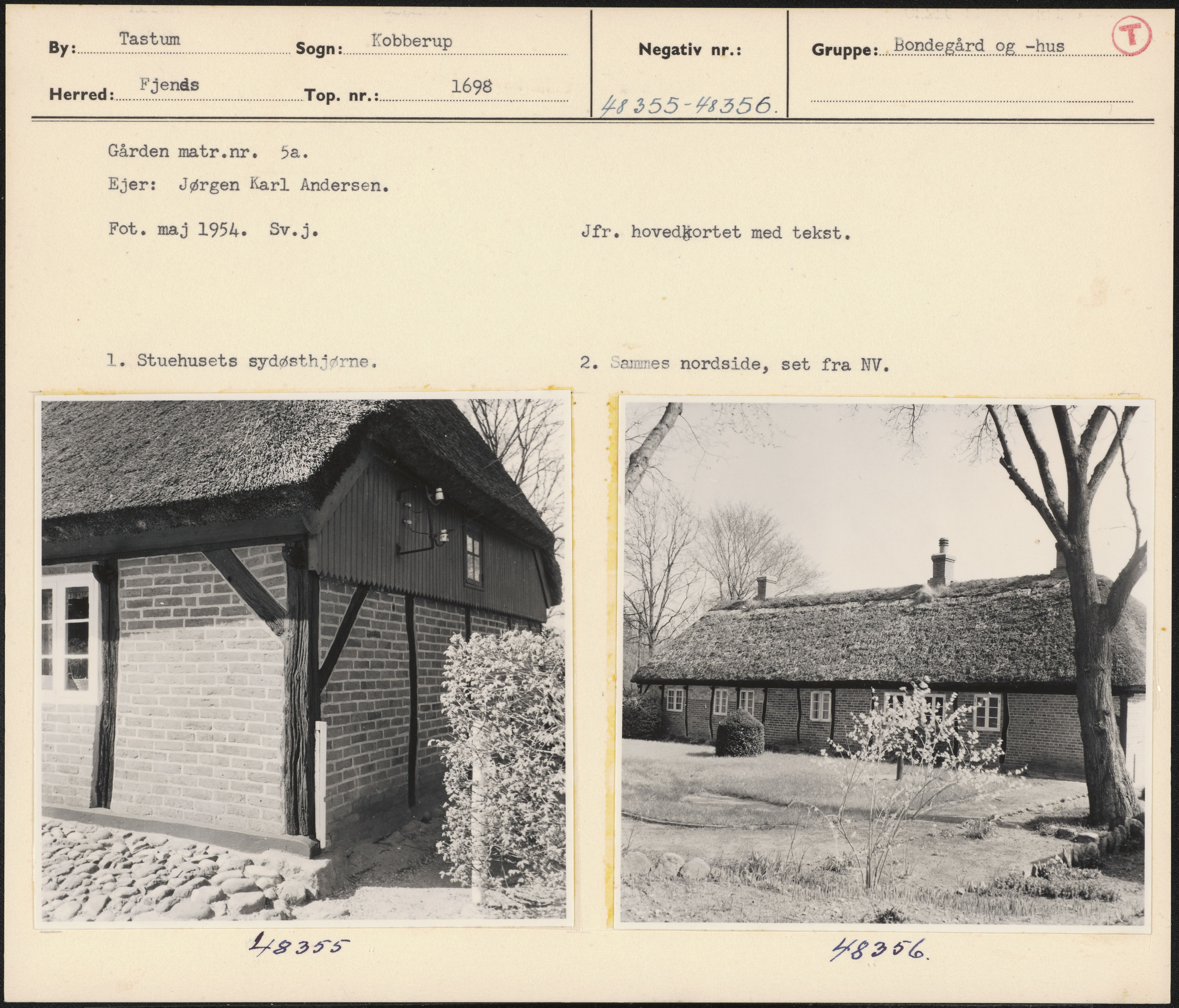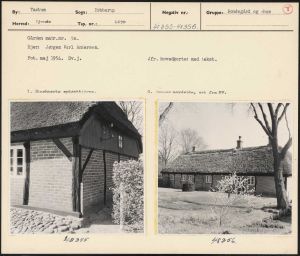 Maskingenkendt tekst fra arkivkort. Gården matr.nr. 52. Ejer: Jørgen Karl Andersen. Fot. maj 1954. Sv.j. Jfr. hovedkortet med tekst. 1. Stuehusets sydøsthisrne. 2. sammes nordside, set fra NV. Lig 355 £F256.