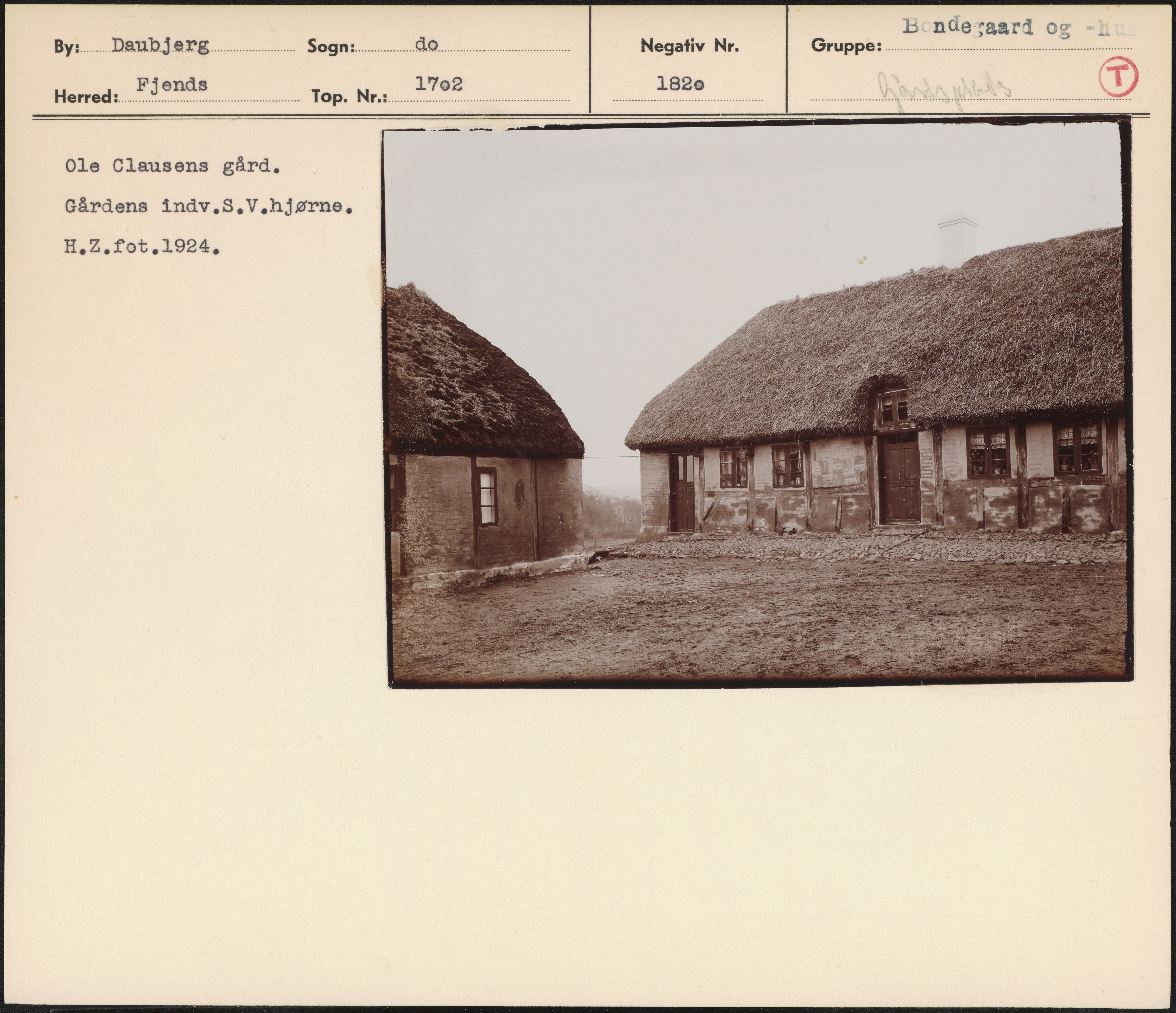 Maskingenkendt tekst fra arkivkort. Ole Clausens gård. Gårdens indv.S.V.hjørne, H.Z.fot,1924,