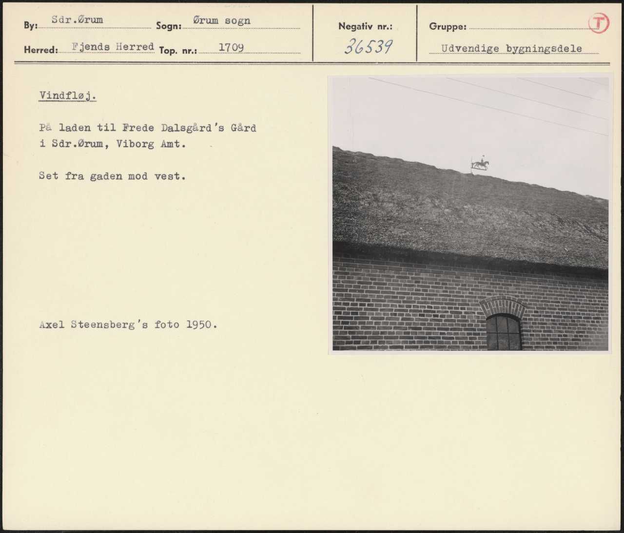 Maskingenkendt tekst fra arkivkort. Vindfløj. På laden til Frede Dalsgård's Gård i Sdr.Ørum, Viborg Amt. Set fra gaden mod vest. Axel Steensberg 's foto 1950.