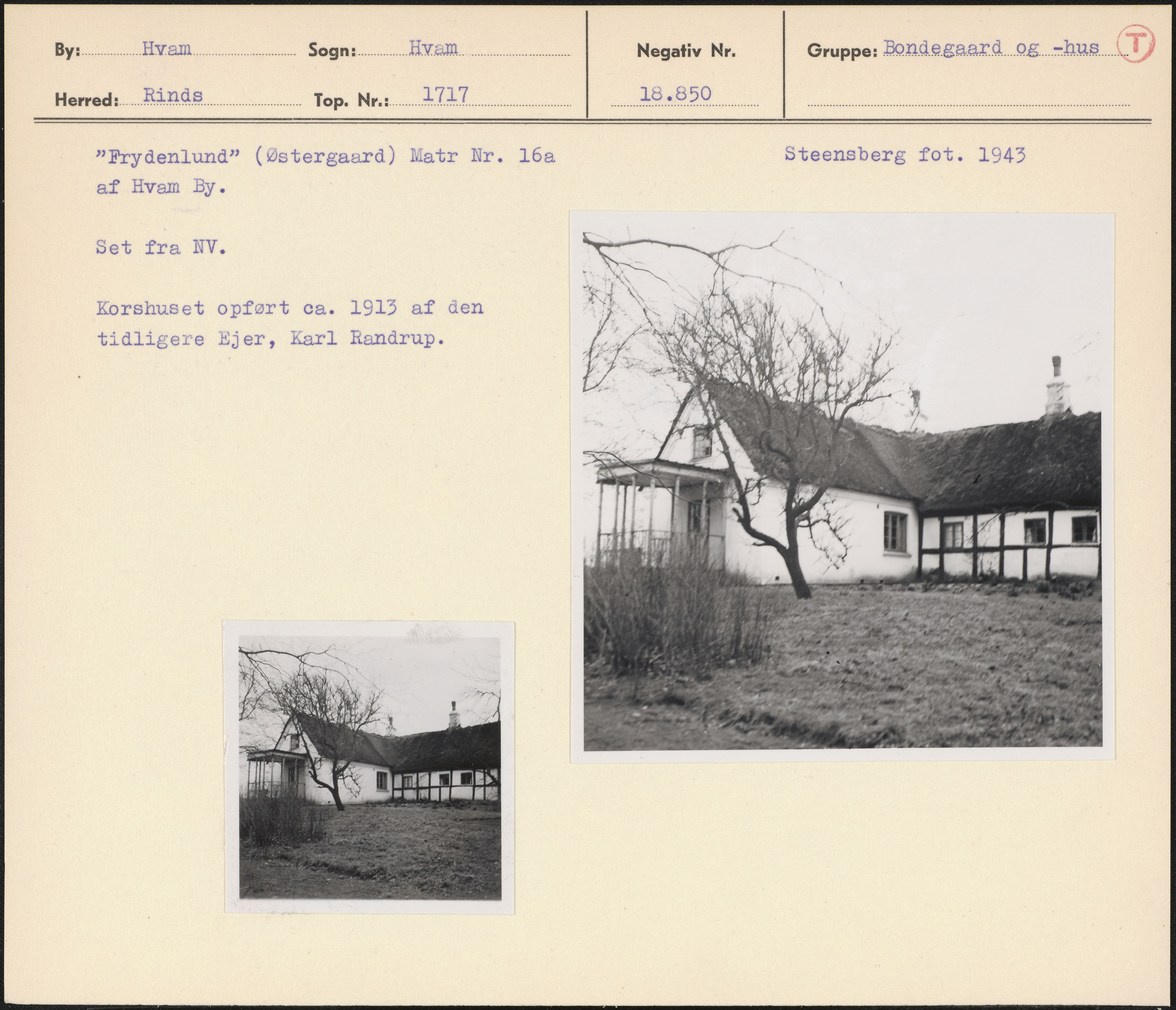 Maskingenkendt tekst fra arkivkort. Frydenlund(Østergaard) Matr Nr. 16a Steensberg fot. 1943 af Hvam By. Set fra NV. Korshuset opført ca. 1913 af den tidligere Ejer, Karl Randrup.