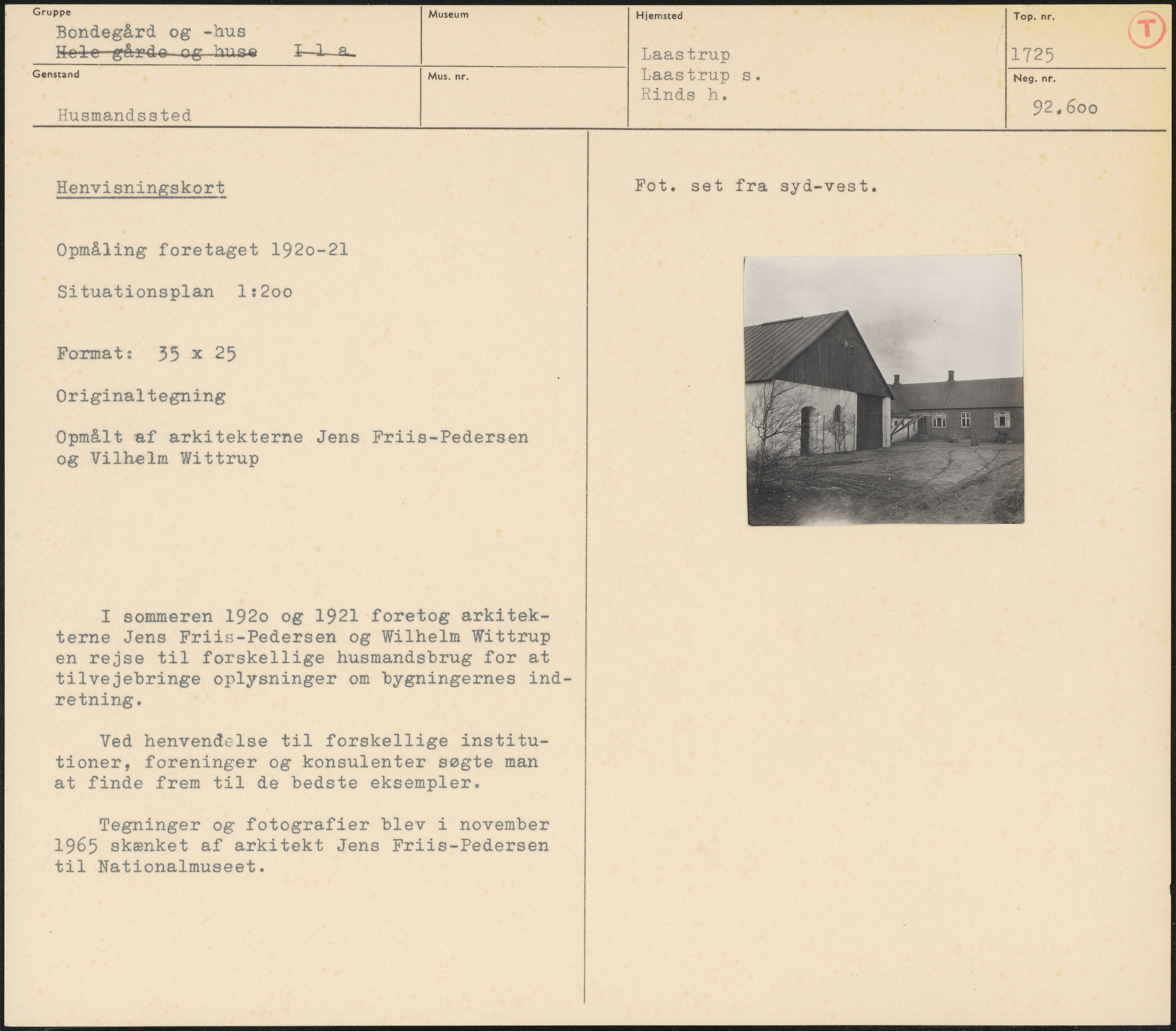 Maskingenkendt tekst fra arkivkort. Henvisningskort Opmåling foretaget 1920-21 Situationsplan 1i:200 Format: 35 x 25 Originaltegning Opmålt af arkitekterne Jens Friis-Pedersen og Vilhelm Wittrup I sommeren 1920 og 1921 foretog arkitek- terne Jens Friis-Pedersen og Wilhelm Wittrup en rejse til forskellige husmandsbrug for at tilvejebringe oplysninger om bygningernes ind- retning. Ved henvendelse til forskellige institu- tioner, foreninger og konsulenter søgte man at finde frem til de bedste eksempler. Tegninger og fotografier blev i november 1965 skænket af arkitekt Jens Friis-Pedersen til Nationalmuseet. Fot. set fra syd-vest.