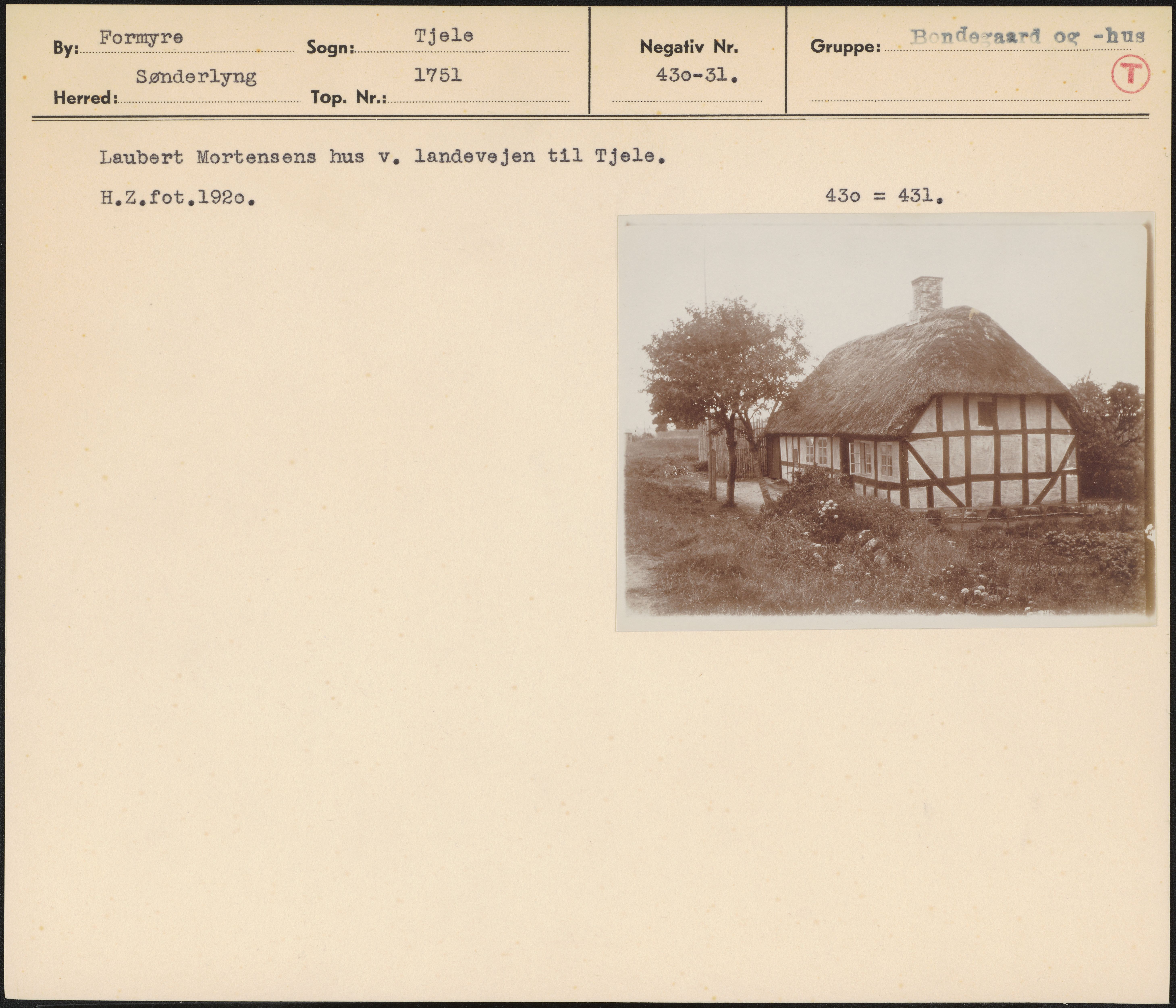 Maskingenkendt tekst fra arkivkort. Laubert Mortensens hus v, landevejen til Tjele, H.2.fot,1920. 430 = 431,