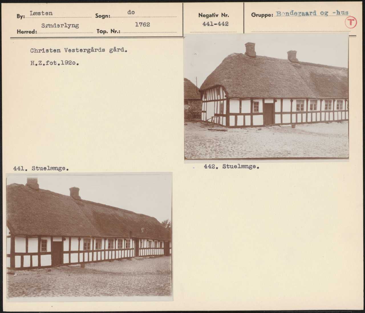 Maskingenkendt tekst fra arkivkort. ret — Christen Vestergårds gård. H.Z.fot.1920. 441, Stuelænge- 442, Stuelænge,
