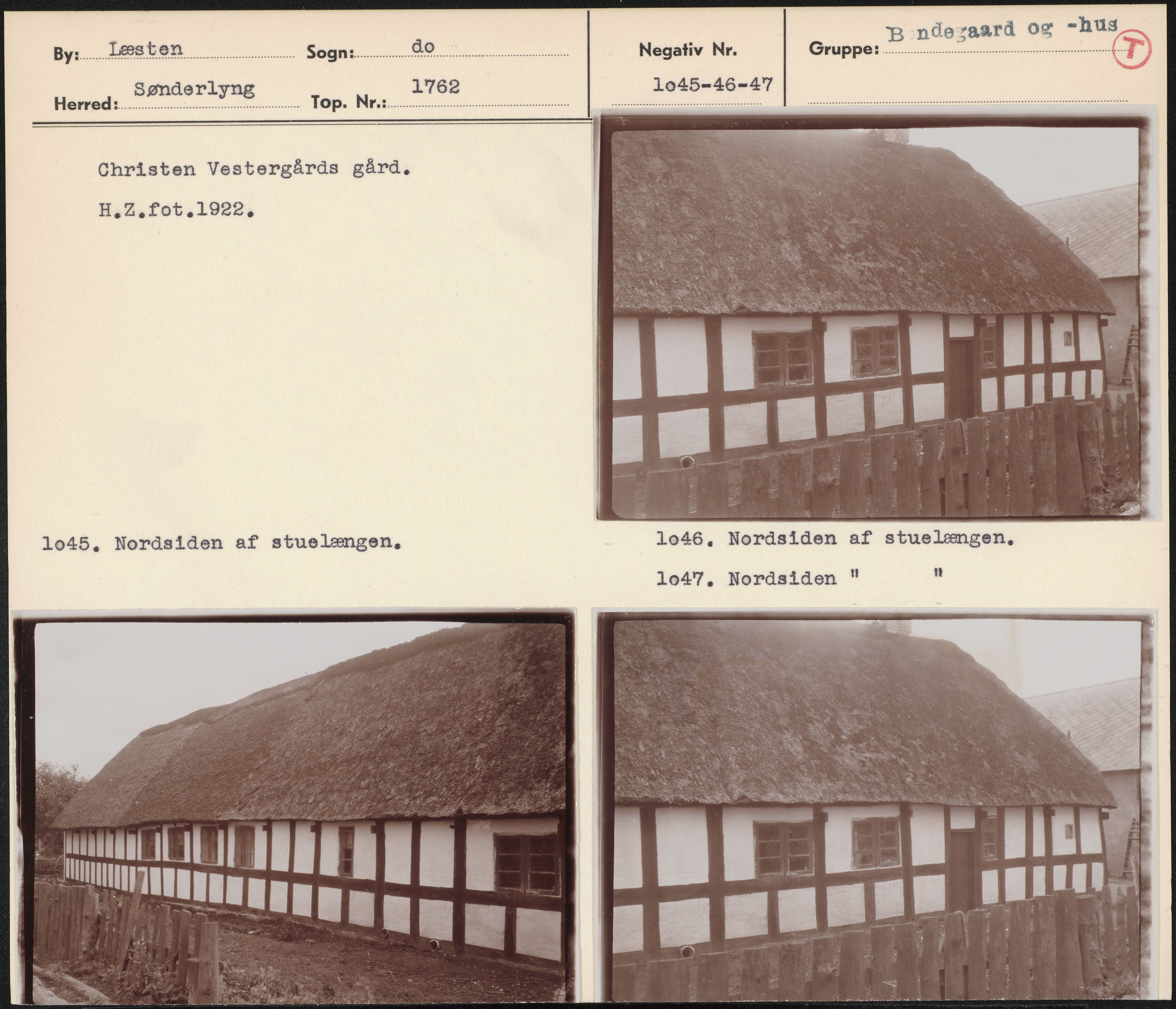 Maskingenkendt tekst fra arkivkort. Christen Vestergårds gård, H.Z.fot.1922. 1045, Nordsiden af stuelængen: 1046, Nordsiden af stuelængen, : 1047, Nordsiden